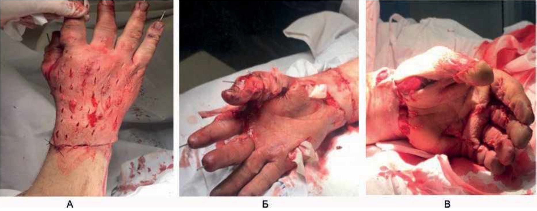 Рис. 2. Операция по И.Е. Микусеву: 1-е сутки – состояние после реплантации. Правая кисть, тыльная (А) и ладонная поверхность (Б); левая кисть, ладонная поверхность (В).