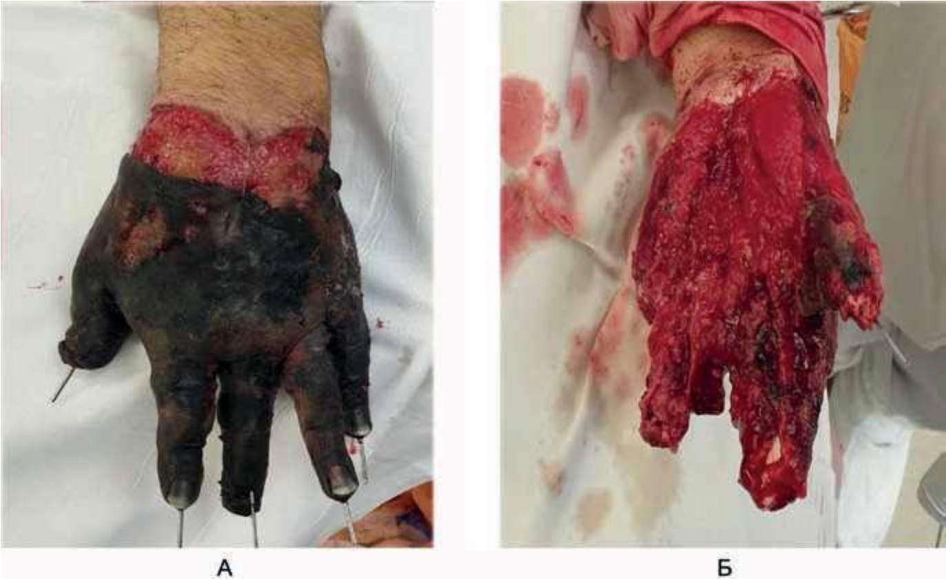 - Мужчина, 37 лет, поступил в приемный покой после затягивания кистей в движущиеся механизмы станка. Время догоспитального этапа составило 2 ч 30 мин. Диагноз при поступлении: «Обширная открытая отслойка кожи обеих кистей. Закрытая ограниченная отслойка кожи дистальных фаланг обеих кистей» (рис. 1). Этапы хирургического лечения представлены на рис. Результат хирургического лечения – неудовлетворительный. Некроз трансплантата связан с несоблюдением принципов реплантации (рис. 3).