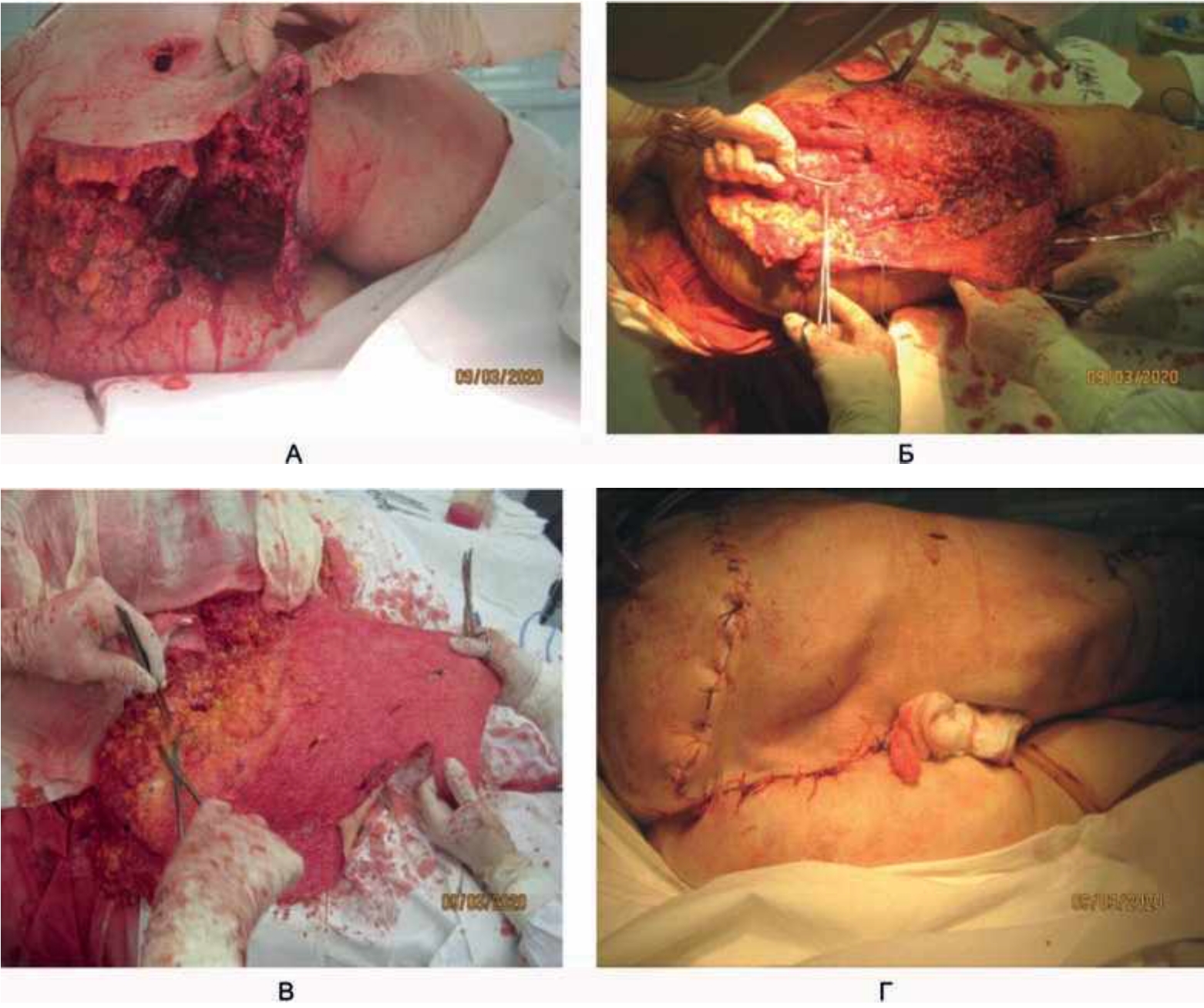 Рис. 6. Состояние на 1-е сутки – 2-й этап операции – реплантация трансплантата по Красовитову. Оценка площади поражения (А), подготовка раневого ложа к реплантации (Б), удаление подкожно-жировой ткани с отслоенного лоскута (В), фиксация лоскута к раневому ложу (Г).