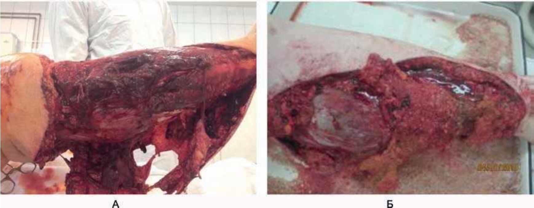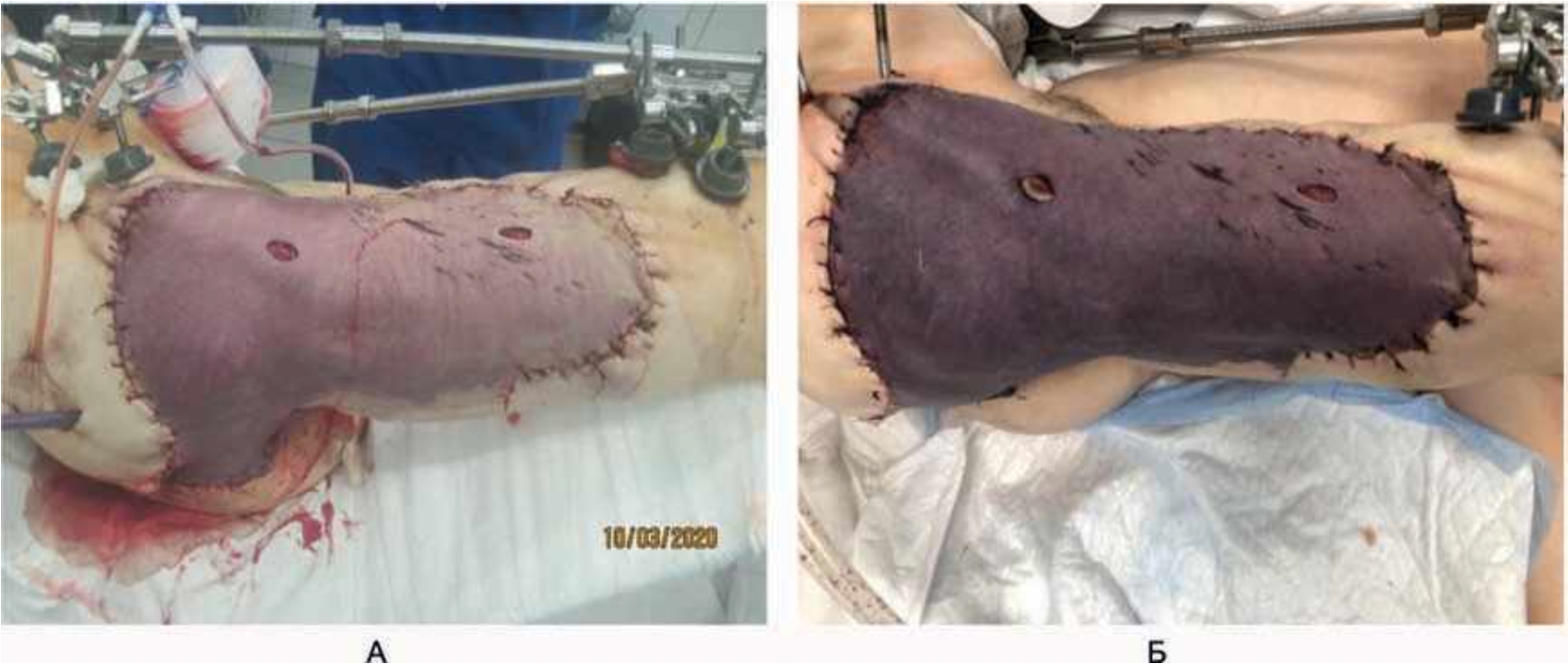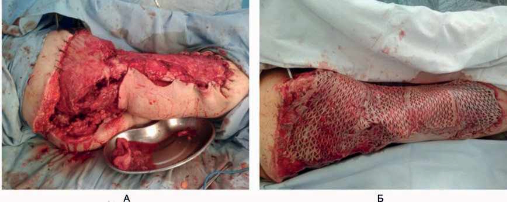 Рис. 8. Тангенциальное удаление гранулирующей ткани на 17-е сутки (А) и свободная аутодермопластика туловища, правой нижней конечности (Б).