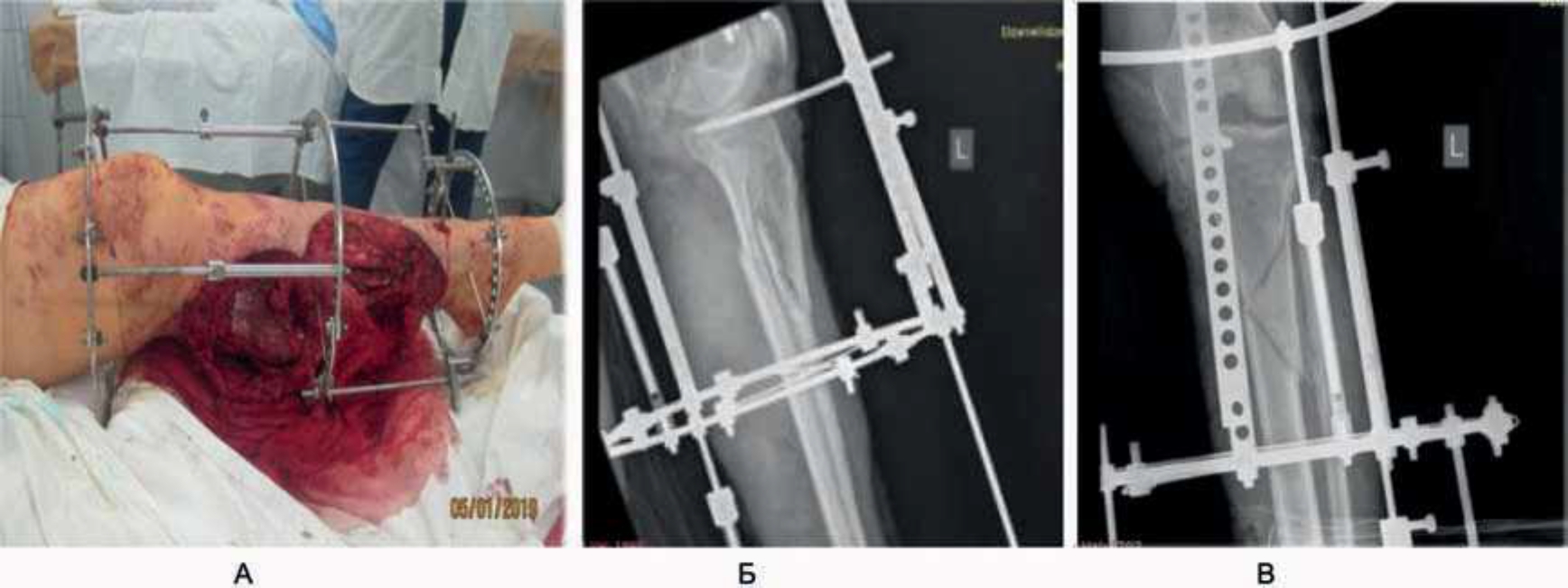 Рис. 11. 1-е сутки: 1-й этап операции – металлоостеосинтез. Установка металлоконструкции (А), рентгеновский снимок, прямая (Б) и боковая проекция (В).