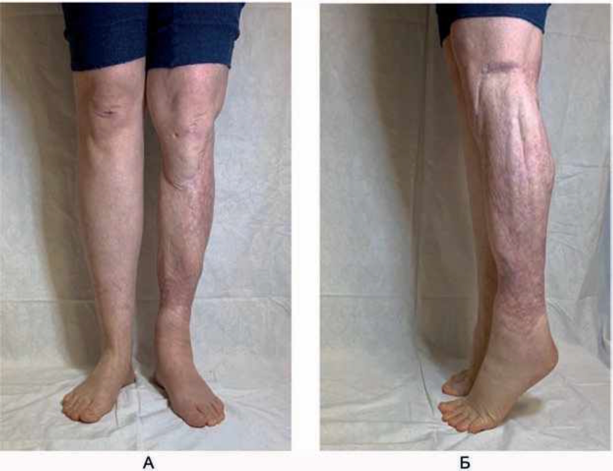 Рис. 14. Период реабилитации. Состояние левой нижней конечности через 1 год: вид прямо (А), сбоку, стоя на цыпочках (Б).