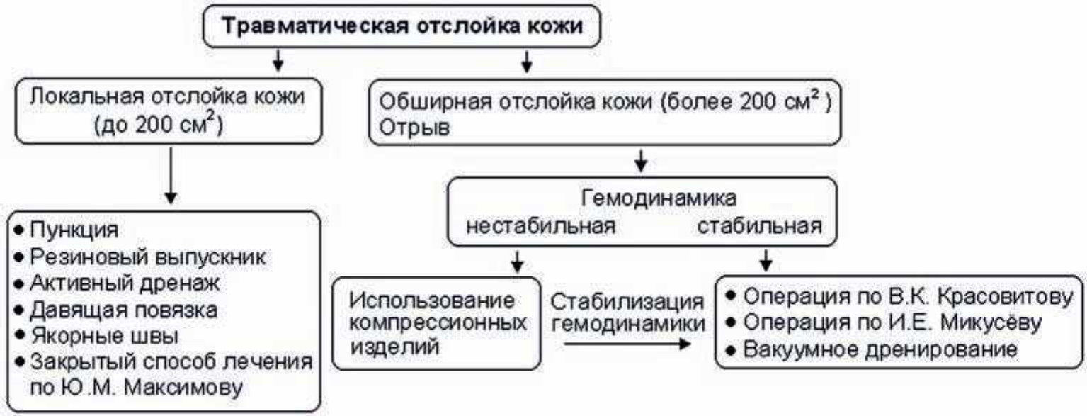 Рис. 15. Обобщенный алгоритм лечения травматической отслойки кожи.