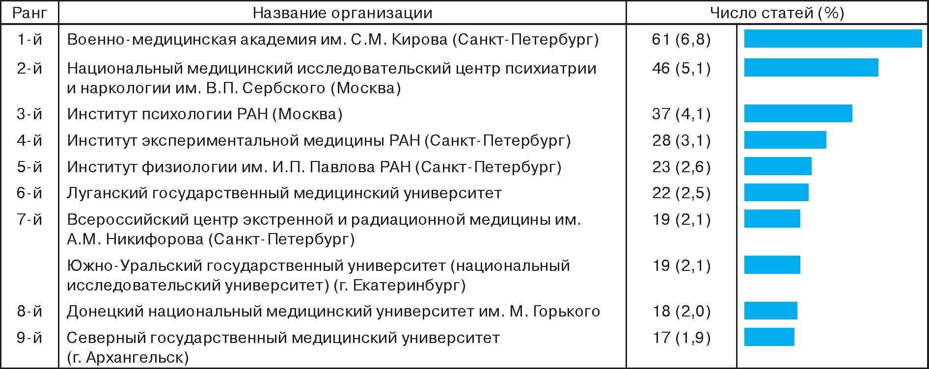 В представленном списке (см. рис. 3) доля статей из журналов составила только 20,8 % от общего массива. Как и следовало ожидать, больше всего статей опубликовали авторы из Военно-медицинской академии им. С.М. Кирова. Суммарная доля статей из ведущих организаций была 32,4 % (см. рис. 4)