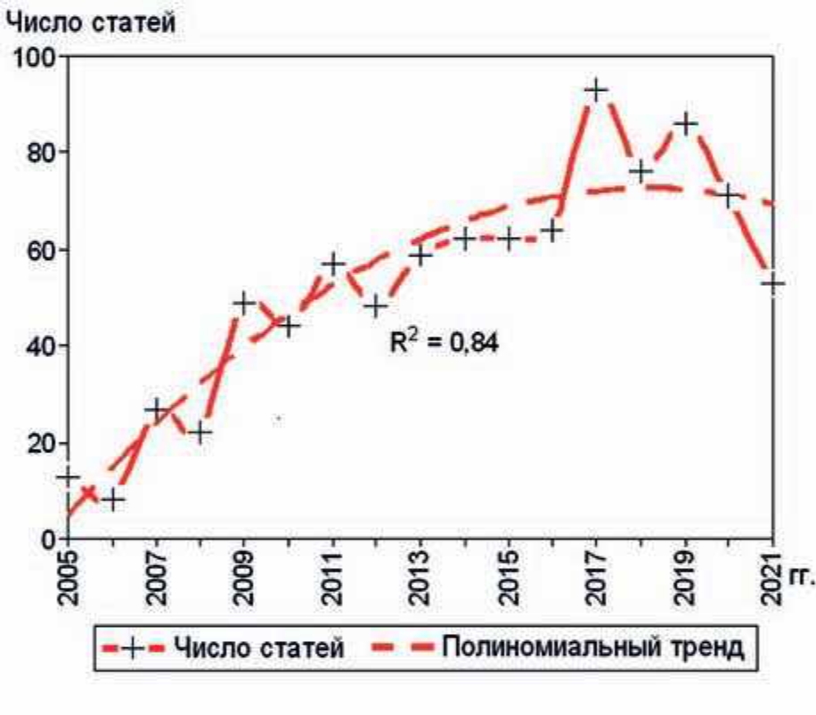 Динамика проанализированных научных статей по боевому стрессу показана на рис. 5. Полиномиальный тренд при высоком коэффициенте детерминации (R2 = 0,84) демонстрирует увеличение интереса у авторов к изучению проблем боевого стресса и роста числа публикаций.