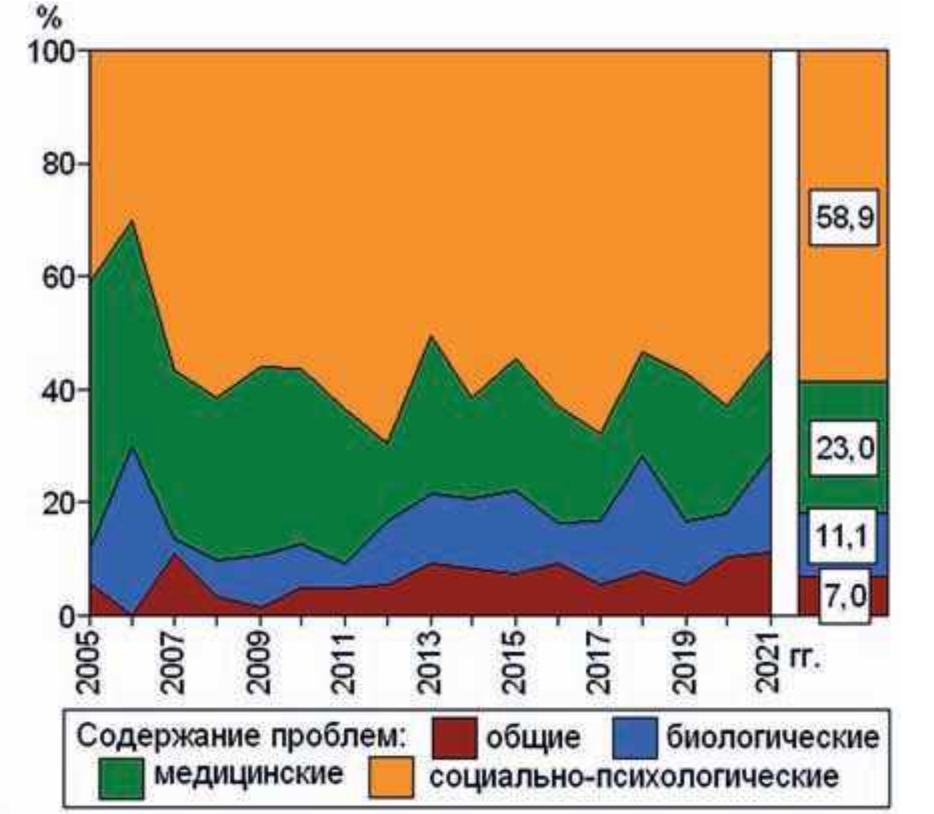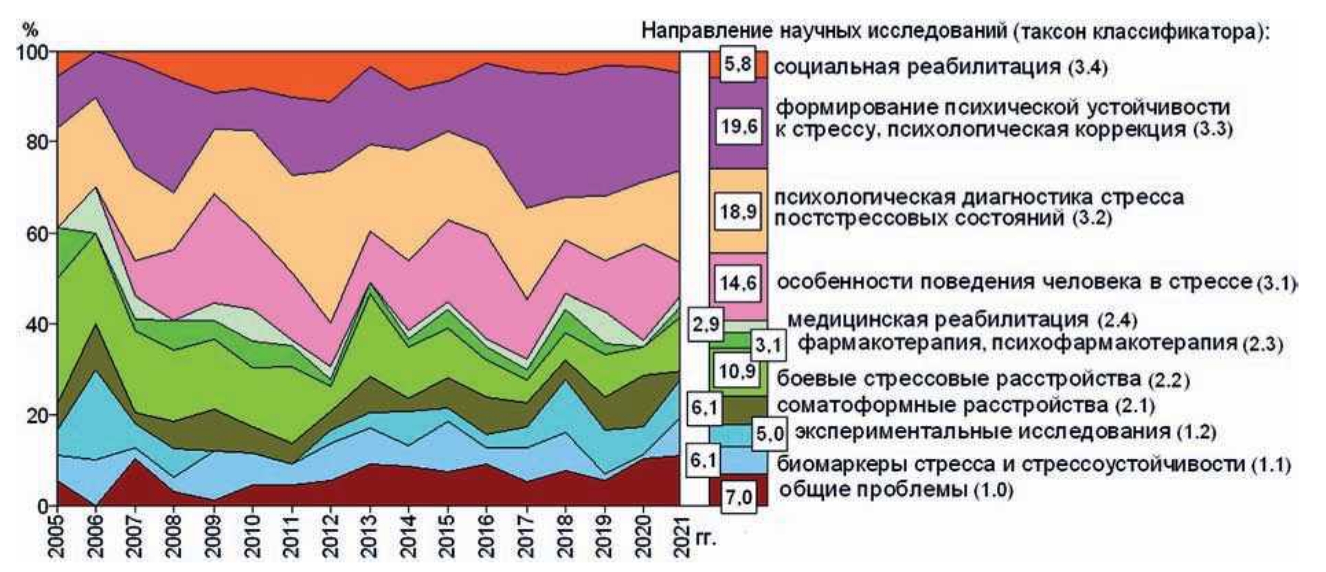 Информационный поиск выявил 894 отклика на журнальные статьи, содержащие проблемы боевого стресса и проиндексированные в Российском индексе научного цитирования в 2005–2021 гг. Ежегодно индексировались 57 [44; 64] отечественных журнальных статей по боевому стрессу. Отмечаются отчетливое увеличение интереса исследователей к проблемам боевого стресса и рост числа таких публикаций. В структуре направлений научных исследований доля общих проблем боевого стресса составила 7 %, биологических – 11,1 %, медицинских – 23 %, социально-психологических – 58,9 %. В динамике структуры содержания выявлено увеличение доли общих, биологических и социально-психологических проблем, уменьшение – доли медицинских проблем.