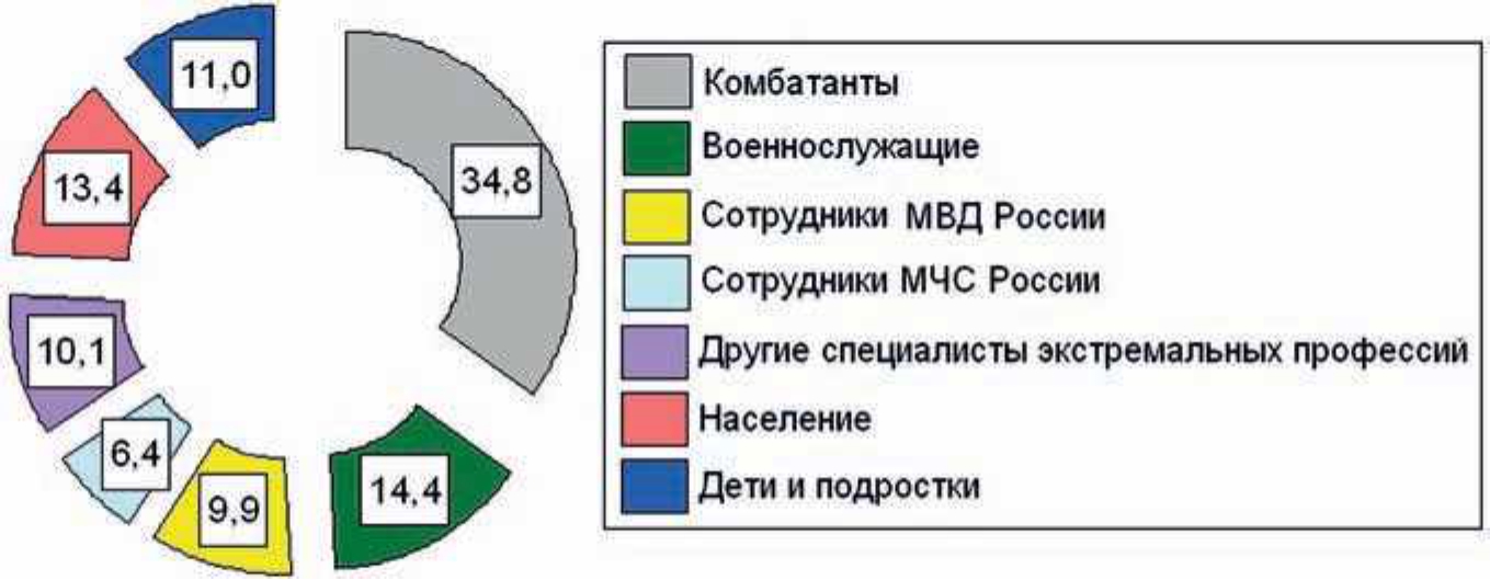 Нередко боевой стресс способствует развитию патологических проявлений (стресс-ассоциированных расстройств, соматоформной патологии), а также различных форм отклоняющегося поведения (аддиктивного, суицидального, гетероагрессивного и др.). Поэтому проблемы боевого стресса и его последствий являются крайне актуальными не только для военной медицины (военной психиатрии), но и для здравоохранения в целом. Причем если боевой стресс переносит каждый военнослужащий в условиях боевой обстановки, то его последствия (ранние, отсроченные, отдаленные) – всегда индивидуальны. Не случайно, что представления о распространенности таких последствий весьма противоречивы (от 10 до 40–50 %, по мнению разных авторов). Особую категорию лиц, нуждающихся в оказании психиатрической и медико-психологической помощи, составляют раненые и пострадавшие терапевтического профиля, у которых клинические признаки боевой психической травмы (по опыту войны в Афганистане) отмечаются в 30–40 % [4, 5].