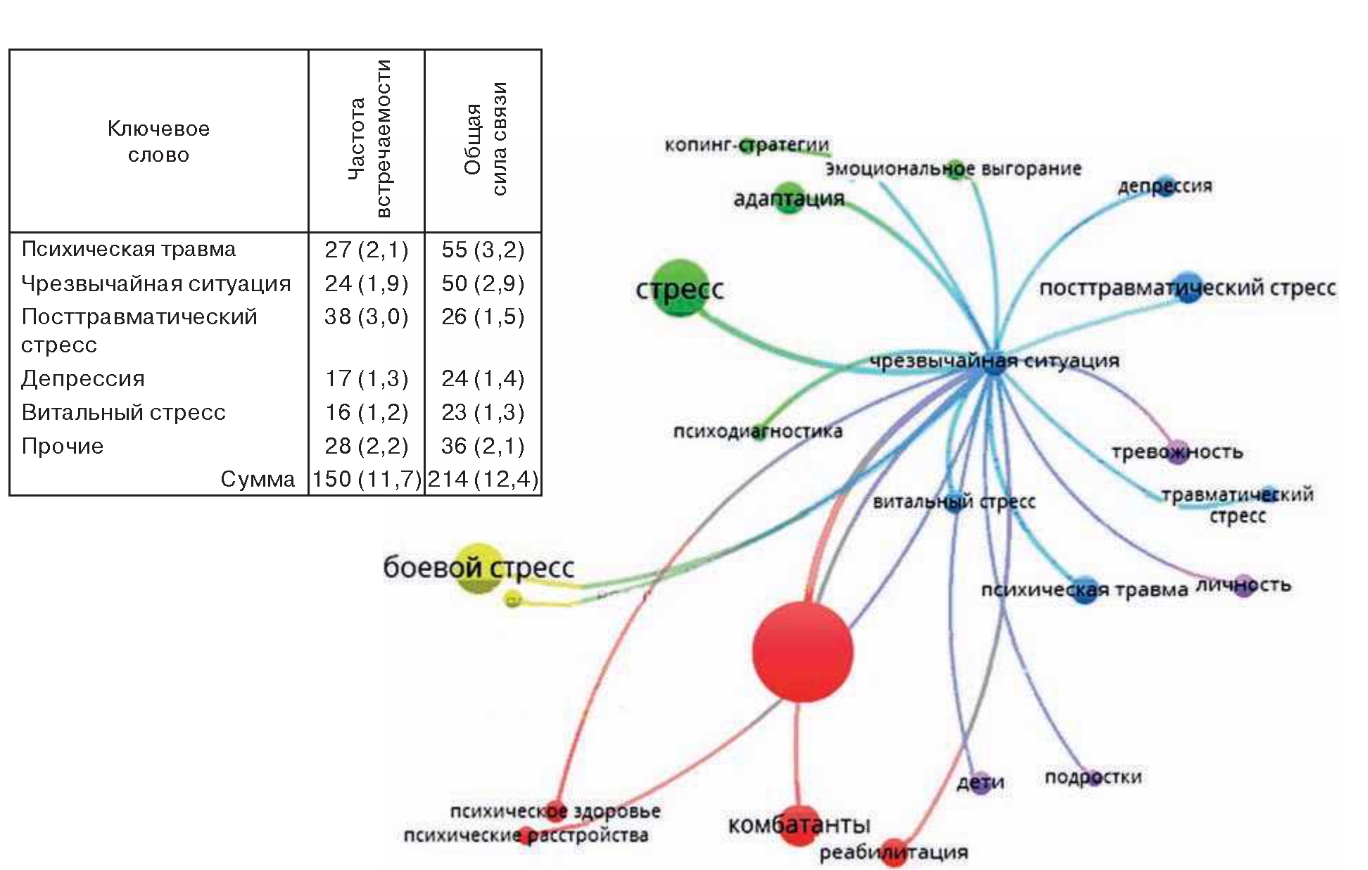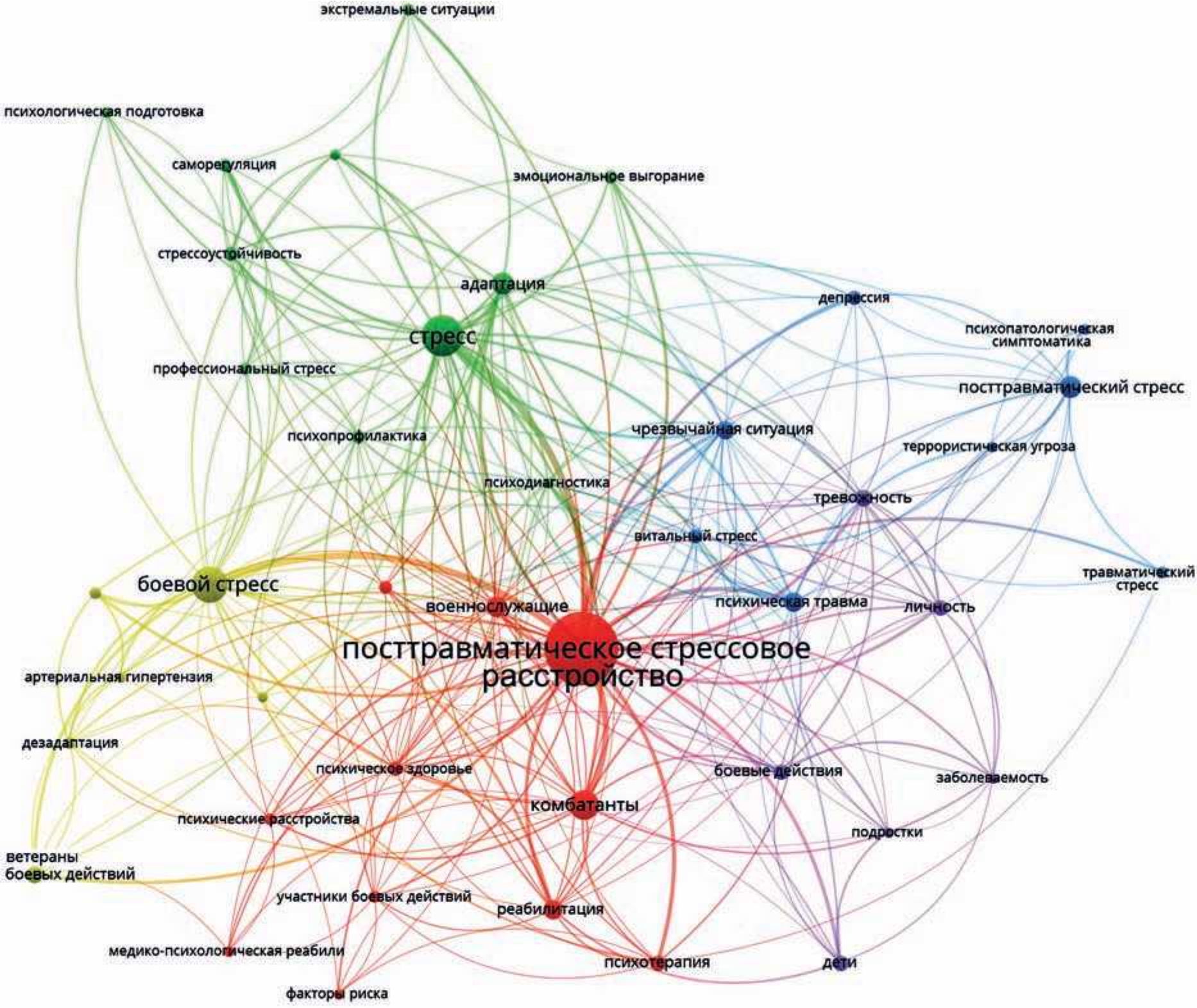 Results and discussion. Annually, fifty-seven 57 [44; 64] papers on combat stress published in Russia were indexed. The distribution by research field included general combat stress problems issues – 7 %, biological aspects – 11.1 %, medical aspects – 23 %, social and psychological aspects – 58.9 %. Content structure dynamics revealed an upward trend in the number of papers devoted to general, biological, social and psychological problems, with a decrease in the number of papers on medical issues. With 9 repetitive key words or 4 repetitive authors, VOSviewer software identified 5 clusters of papers and 11 academic co-authorships. Cluster 1 included a set of papers on combat stress disorder with Total Link Strength of 40.1 %, cluster 2 – social and psychological problems of combat stress (22.2 %), cluster 3rd – psychosomatic disorders in combat veterans (13.1 %), cluster 4 – human behavior in extreme environments (12.4 %), cluster 5 – stress manifestations in civilians during combat operations (12.2 %).