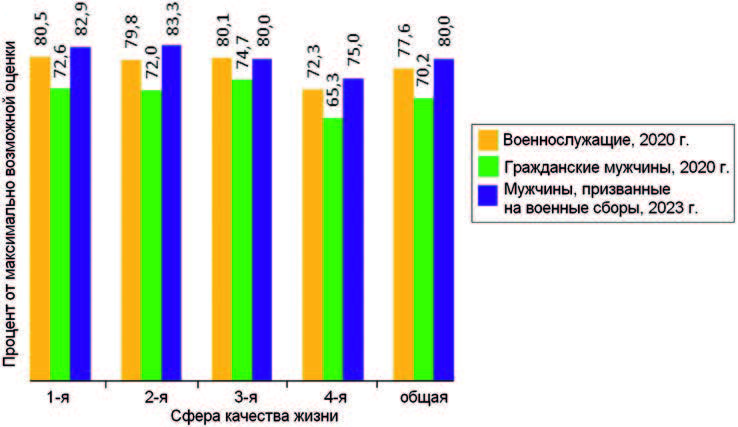 Тем не менее, сравнительный анализ показал статистически значимо более высокие оценки во всех сферах опросника и общей оценке качества жизни граждан, призванных на сборы, относительно гражданских мужчин в арктических районах Архангельской области (p < 0,001 во всех сравнениях). В сравнении с военнослужащими статистически значимо более высокие оценки были получены только во 2-й сфере (самовосприятие) (p = 0,001) и в общей оценке качества жизни (p = 0,039) (см. рисунок).