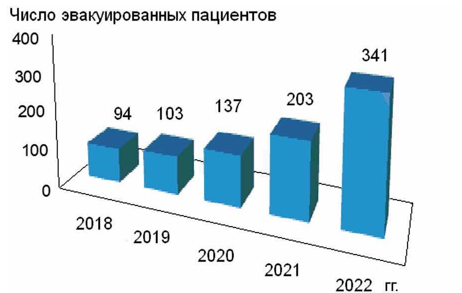 Results and analysis. The data analysis showed that the demand for inter-hospital transportation is increasing incrementally year to year. Among all transported victims, 50 % were patients with isolated trauma, 41.5 % with polytrauma, and 8.5 % with thermal burns. In most cases (86.7 %), inter-hospital transportation was carried out by specialized CEMP emergency response teams, including 39.3 % of cases by air medical teams equipped with light-class helicopters. In 13.3 % of cases ambulance crews were engaged.