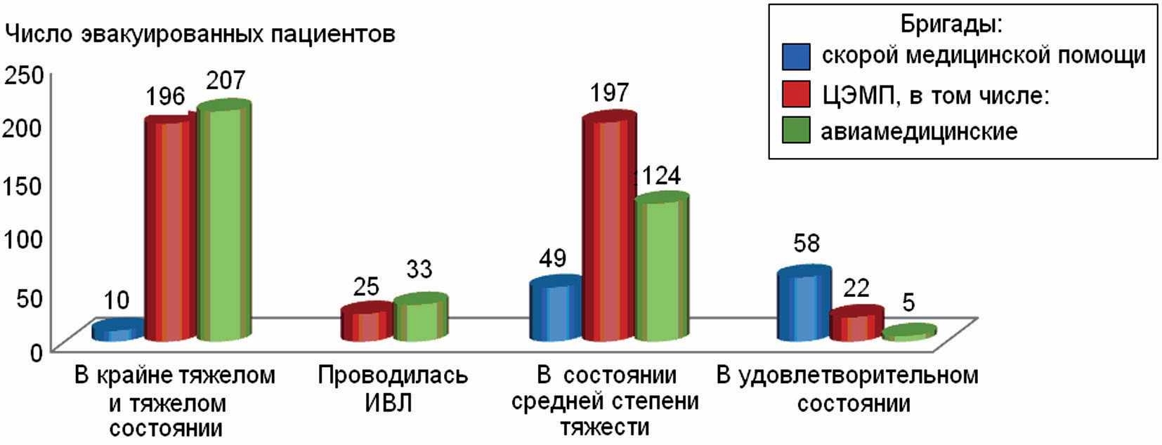 Вид бригад, проводивших межбольничную транспортировку, и тяжесть состояния пациентов представлены на рис. 3. Всем пострадавшим и больным, потребовавшим проведение ИВЛ, данная манипуляция выполнялась специализированными бригадами ЦЭМП, при этом из 58 пациентов с ИВЛ у 33 она была выполнена авиамедицинскими бригадами (см. рис. 3).