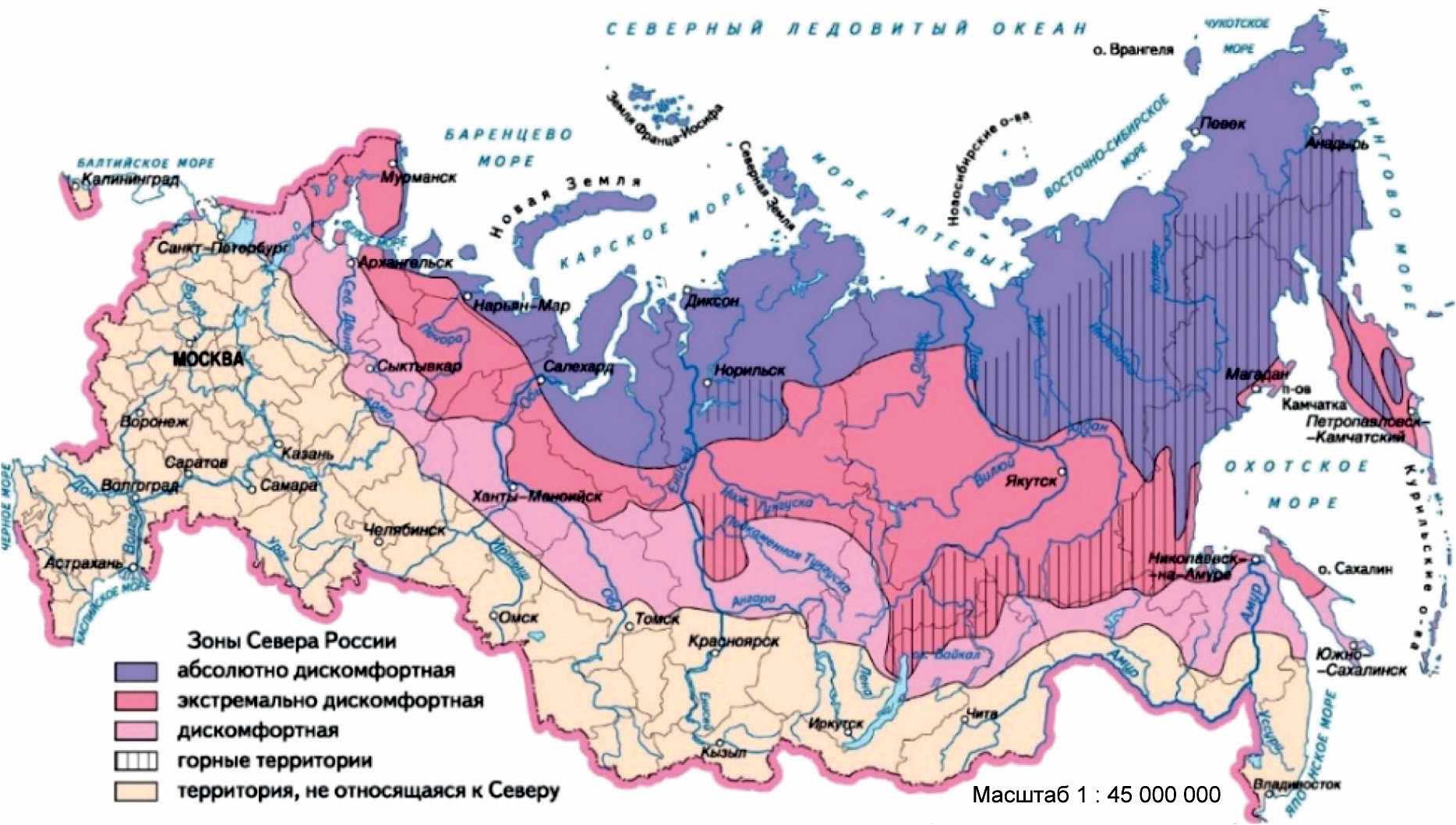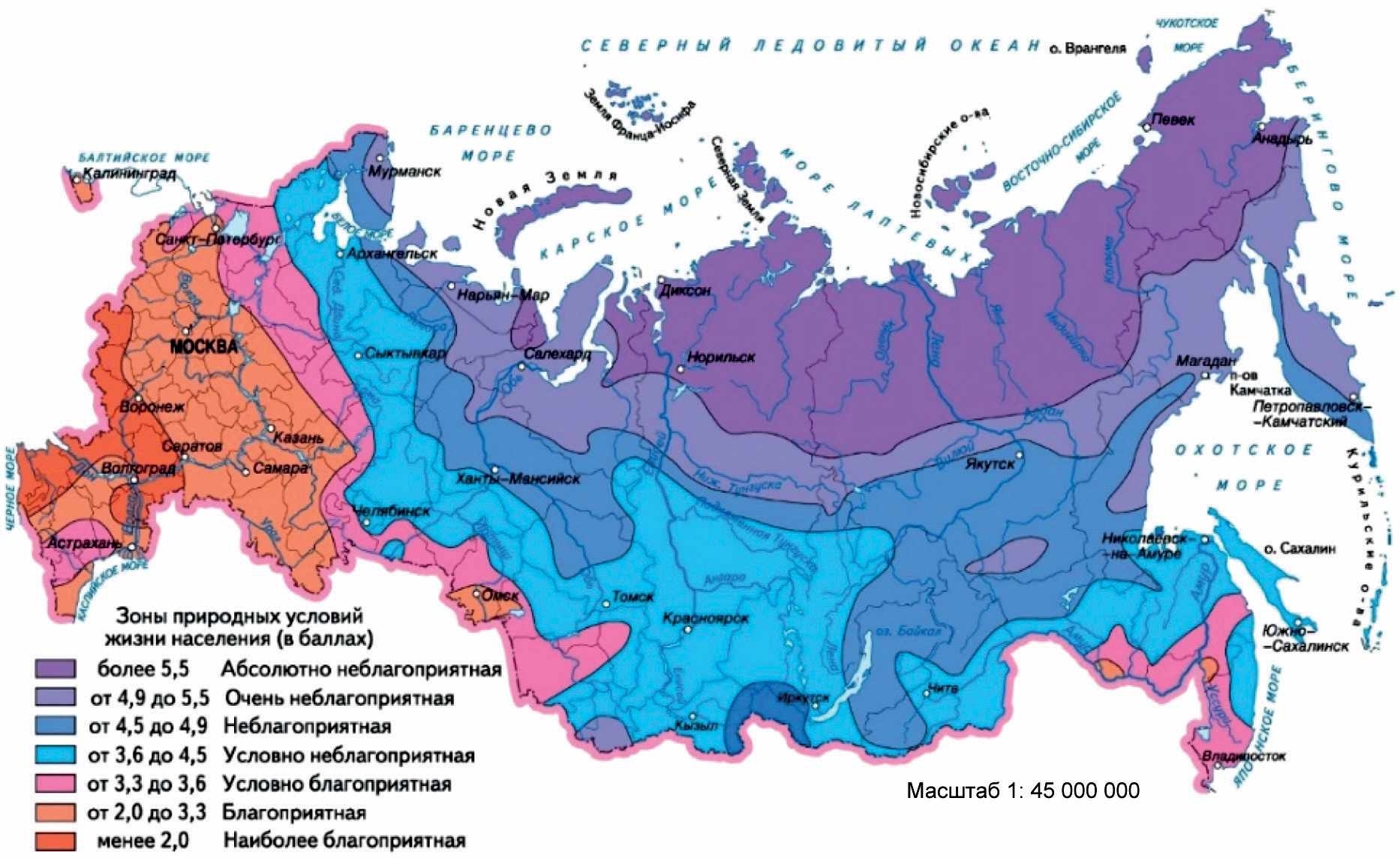 Рис. 1. Районирование территории России по природным условиям для жизни населения [7].