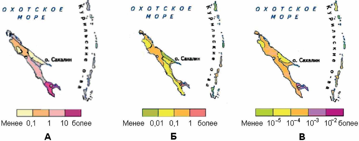 По данным Национального атласа России, в Сахалинской обл. риск вероятного ущерба (в млн руб.) от опасных природных процессов носит неоднородный характер: выше он на юге области, что связано с особенностями территориального расположения хозяйственных и жилых объектов (рис. 3). При этом на территории всей Сахалинской обл. отмечается значительный риск возникновения ЧС как местного, так и территориального, и регионального уровней (рис. 4А–В).
