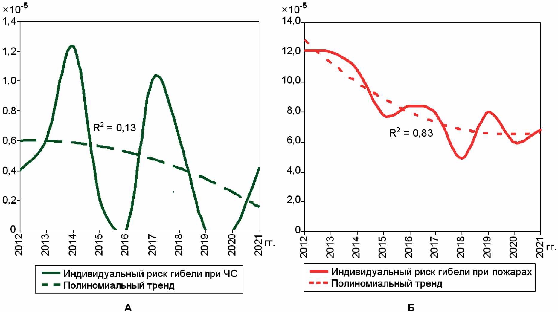 6. Рис. 5. Динамика индивидуального риска гибели при ЧС (А) и пожарах (Б) в Сахалинской обл.