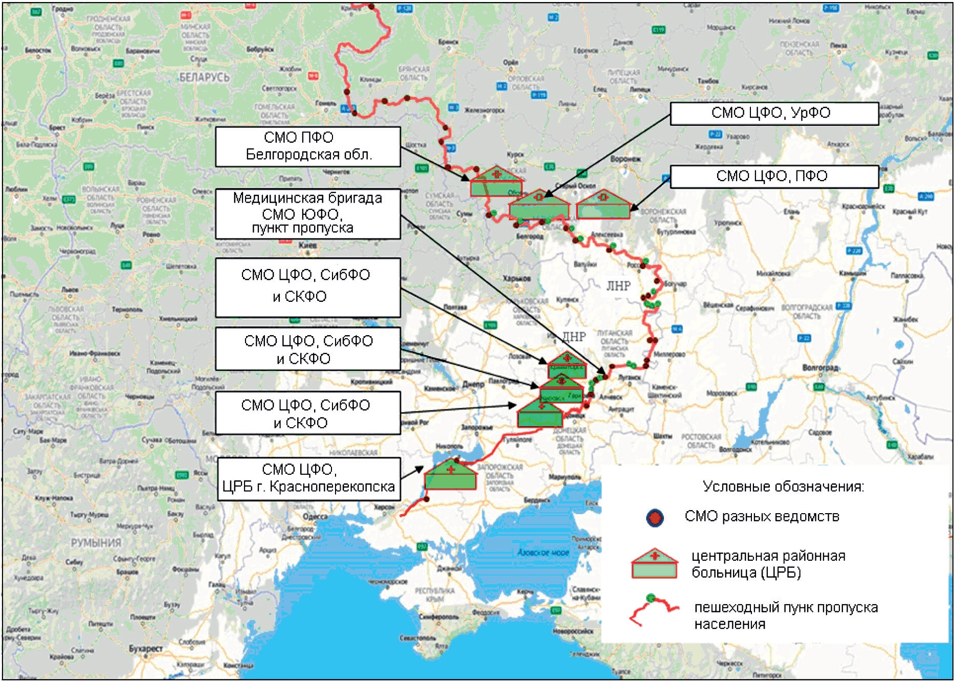 В очаге ЧС и зоне проведения специальной военной операции, а также в смежных регионах образуются потоки раненых, больных и пораженных военнослужащих и гражданского населения на фоне разрушения инфраструктуры территориальной системы здравоохранения.
