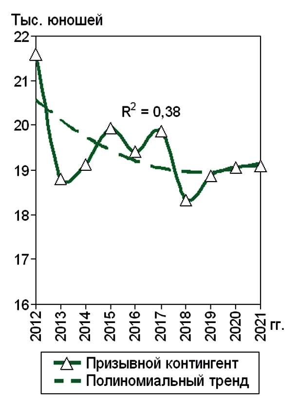 Численность граждан призывного возраста в Оренбургской обл. представлена на рис. 1. Полиномиальный тренд численности призывников при низком коэффициенте детерминации (R2 = 0,38) показывал уменьшение данных. Если в 2012 г. число призывников было 21,6 тыс., то в 2021 г. их стало 19,1 тыс., уменьшение – на 11,6 %.