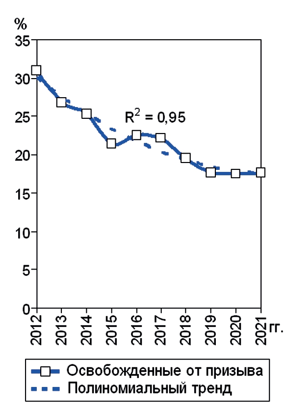 Годность к военной службе по состоянию здоровья является основным показателем, характеризующим здоровье призывников. За 10 лет среднегодовая доля призывного контингента, освобожденного от призыва в ВС России, составила (22,1 ± 1,4) %. В 2012 г. в Оренбуржье она составляла 31 %, т. е. каждый третий гражданин не призывался на военную службу, имея отклонения в состоянии здоровья. На рис. 2 показана динамика уровня годности призывников к военной службе в Оренбургской обл. Полиномиальный тренд уровня годности призывников при очень высоком коэффициенте детерминации (R2 = 0,95) показывал уменьшение показателей. В 2021 г. были освобождены от призыва на военную службу уже только 17,6 % призывников, по сравнению с 2012 г. уменьшение статистически достоверно на 13,4 % (p < 0,001).