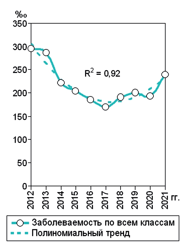 | Заболеваемость по всем классам | 218,78 ± 13,49 | 100,0 |