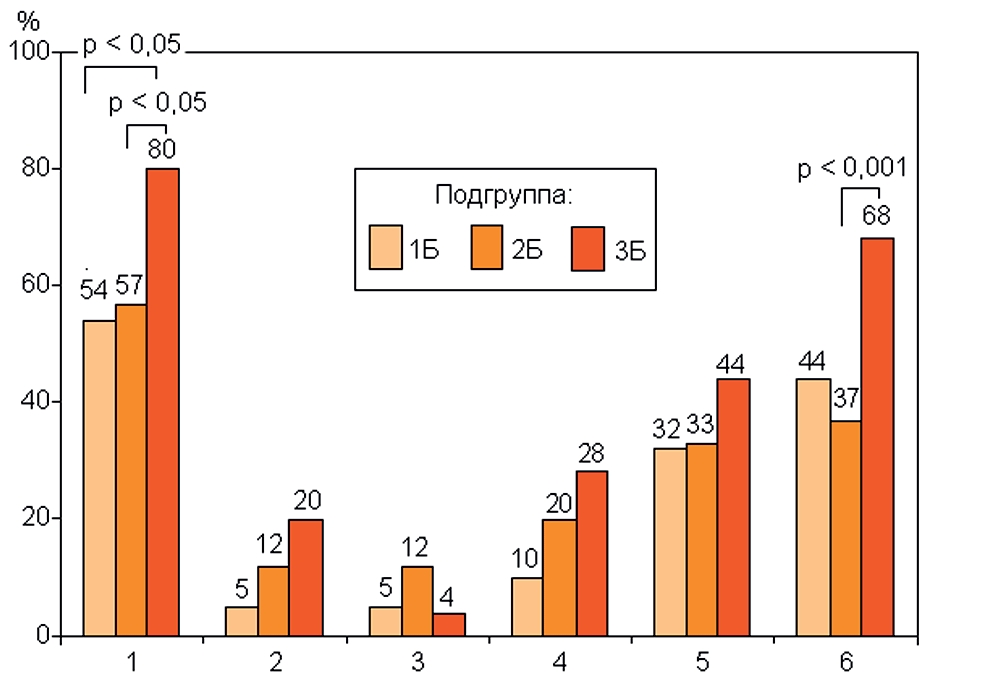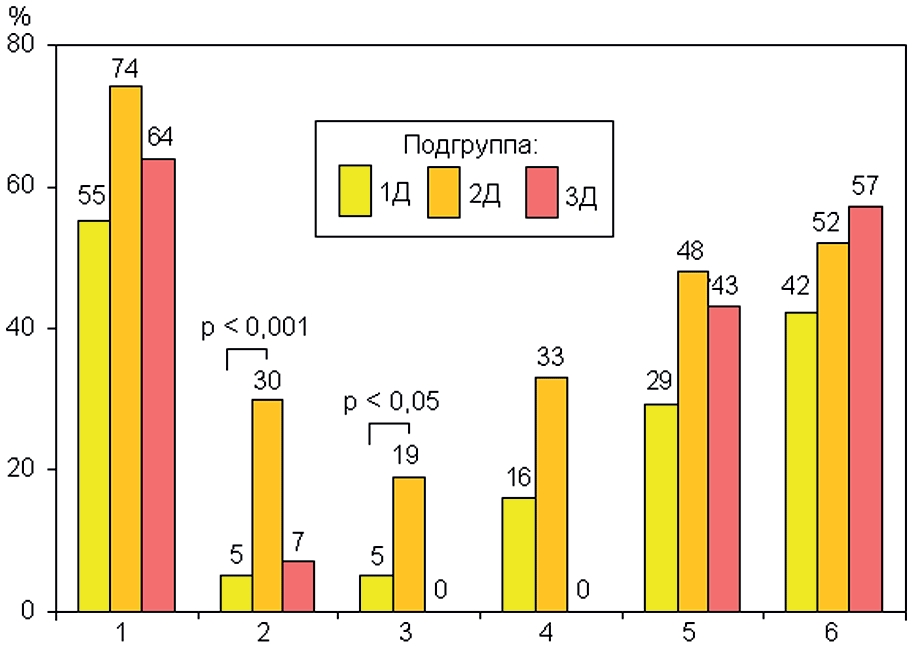 Рис. 1. Неврологические нарушения в подгруппе КМСиСТ. Здесь и на рис. 2–5: 1 – боль в спине, 2 – снижение сухожильных рефлексов, 3– снижение чувствительности по сегментарному типу, 4 – симптомы натяжения корешков, 5 – мышечно-тонический синдром, 6 – статико-динамические нарушения.