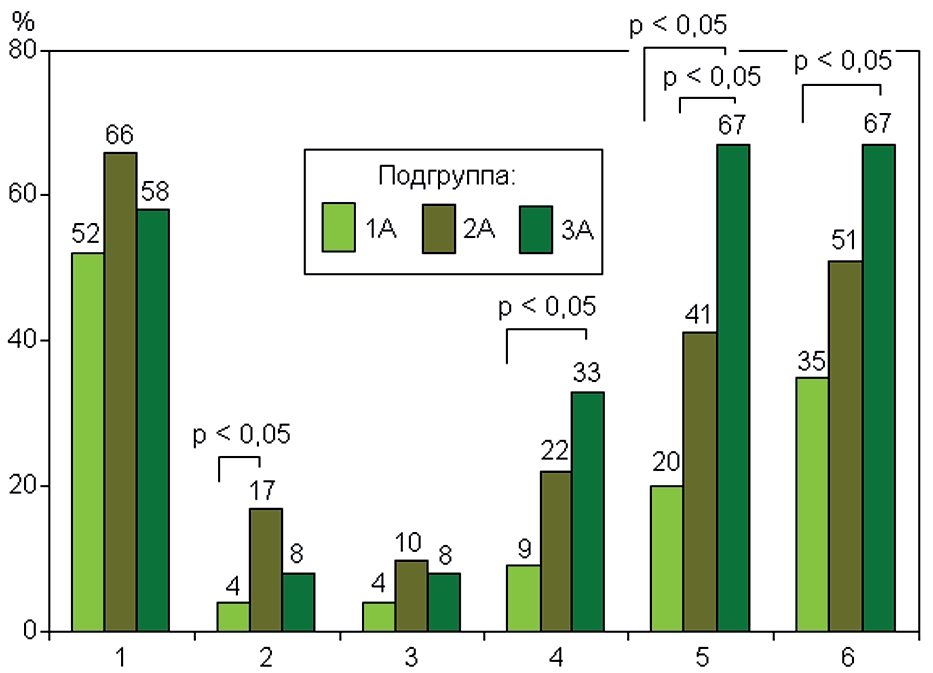 Возрастная подгруппа (n): | 1А (46) | 2А (59) | 3А (12) |