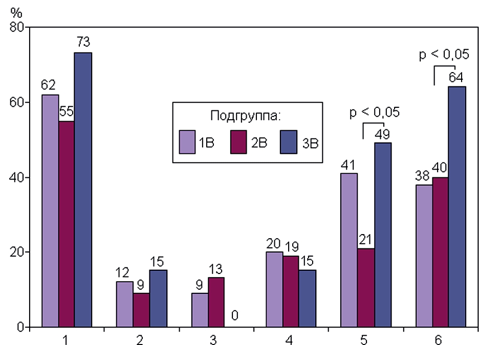 Подгруппа с профессиональной нагрузкой, (n): | 1В (34) | 2В (47) | 3В (33) |