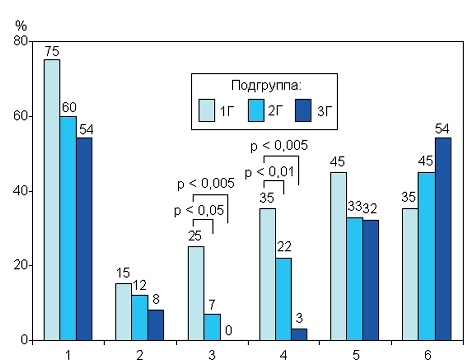 Подгруппа по успешности профессиональной деятельности, (n): | 1Г (20) | 2Г (60) | 3Г (37) |