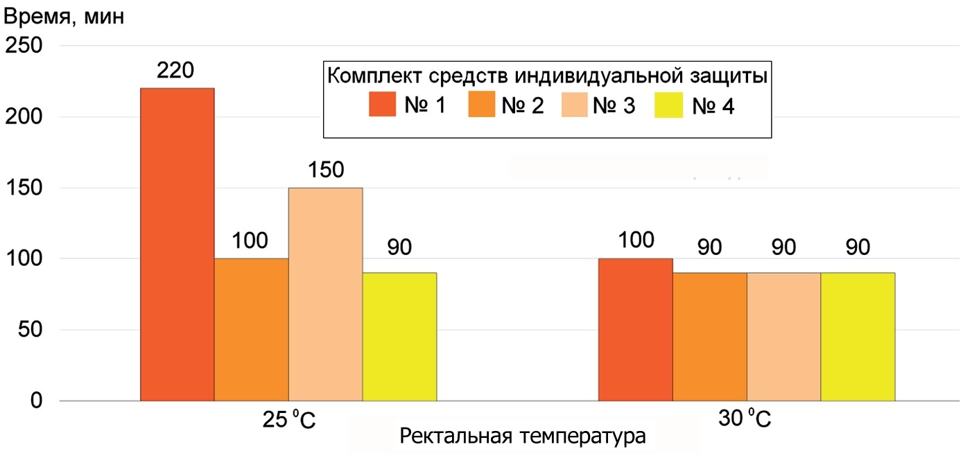 Время достижения допустимых значений теплового состояния по показателю ректальной температуры в эксперименте представлено на рис. 3 [3]. Из приведенных данных видно (см. рис. 3), что при допустимой температуре воздуха (25 °C) ректальная температура достигала предельного значения (37,6 °С) в комплекте № 4 уже через 1,5 ч. В комплекте № 1 это время было существенно дольше и составляло почти 4 ч. С повышением температуры воздуха в термокамере до 30 °C ректальная температура испытателей-добровольцев достигала предельного значения через 90–100 мин, примерно одинаково для всех исследуемых комплектов СИЗ. Таким образом, диапазон времени достижения опасного теплового состояния для организма варьировал в пределе 1,5–3,5 ч в зависимости от типа СИЗ и температуры окружающей среды.