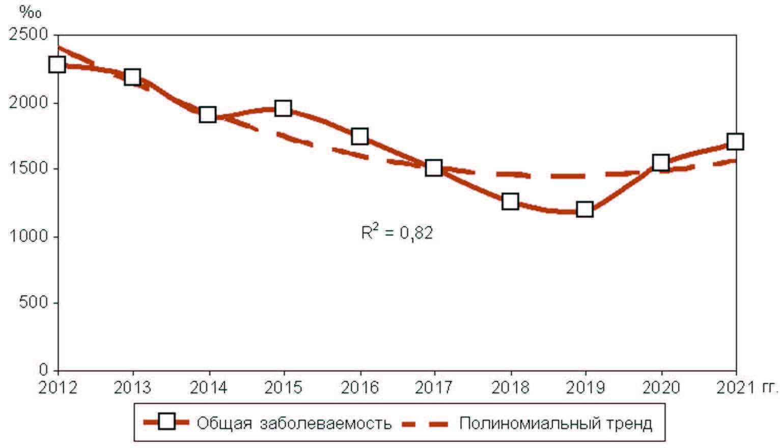 Results and discussion. The long-term average incidence (total morbidity) was 1653.1 ‰, with primary morbidity –