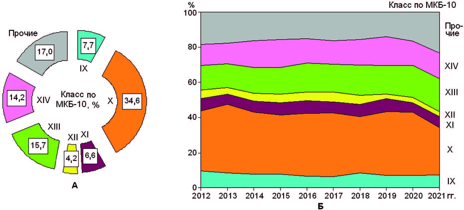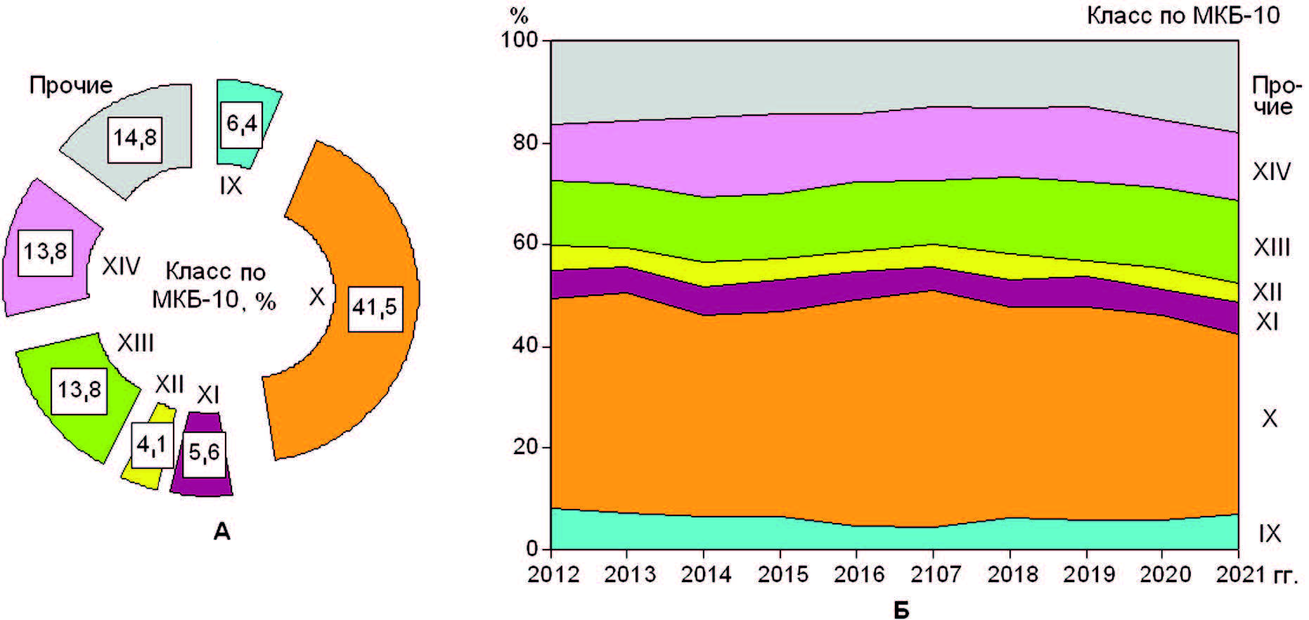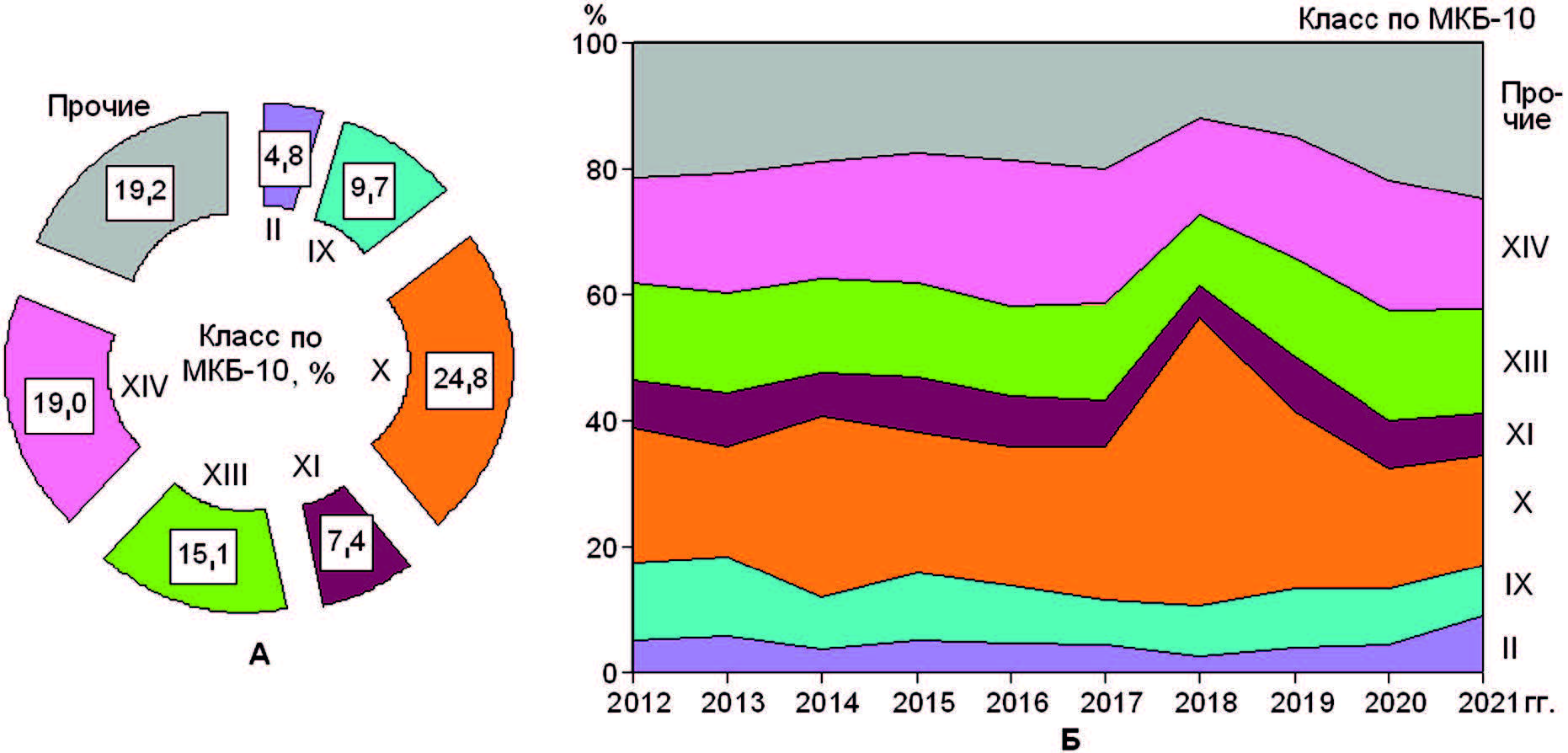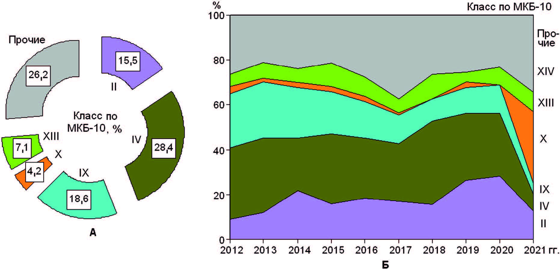 Медико-статистические показатели соотнесли с основными классами болезней и причин смерти, принятых в Международной статистической классификации болезней и проблем, связанных со здоровьем, 10-го пересмотра (МКБ-10) (табл. 1) [https://mkb-10. com/]. При анализе болезней по МКБ-10 акцент делали на ведущие классы, показатели которых имели вклад в структуру не менее 4 %.