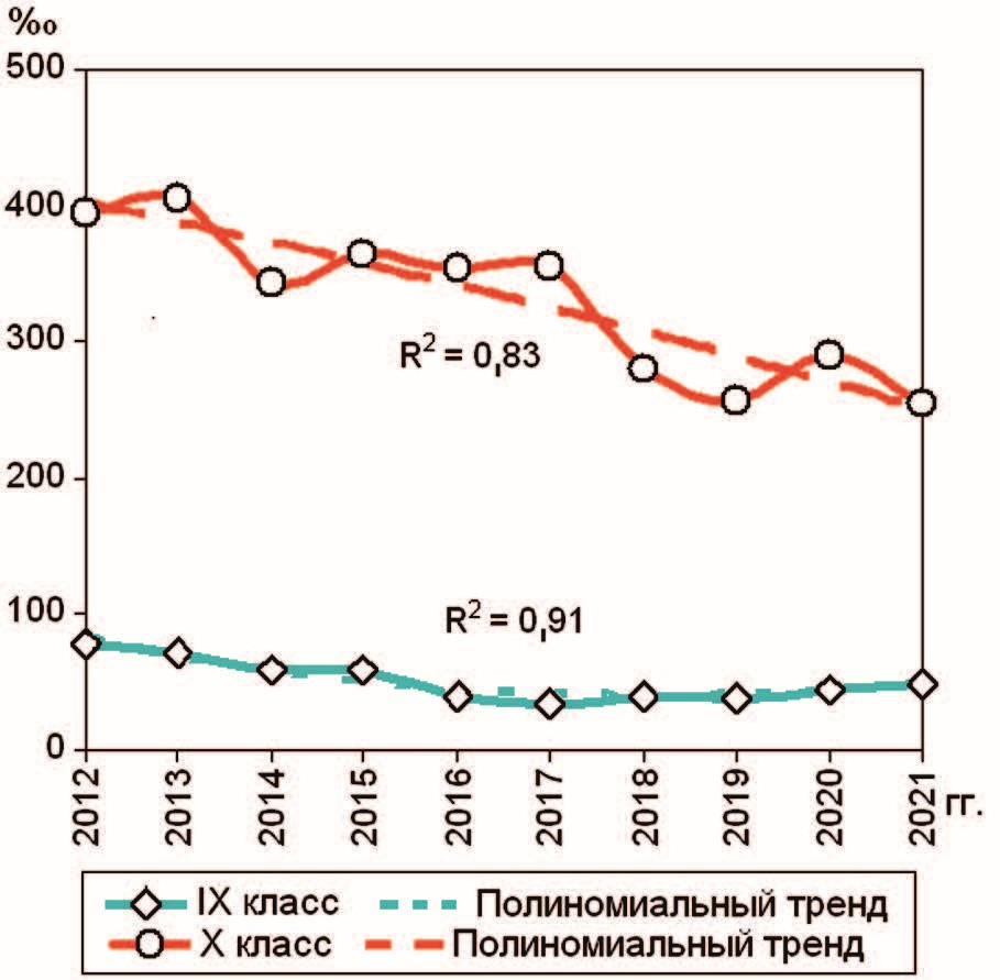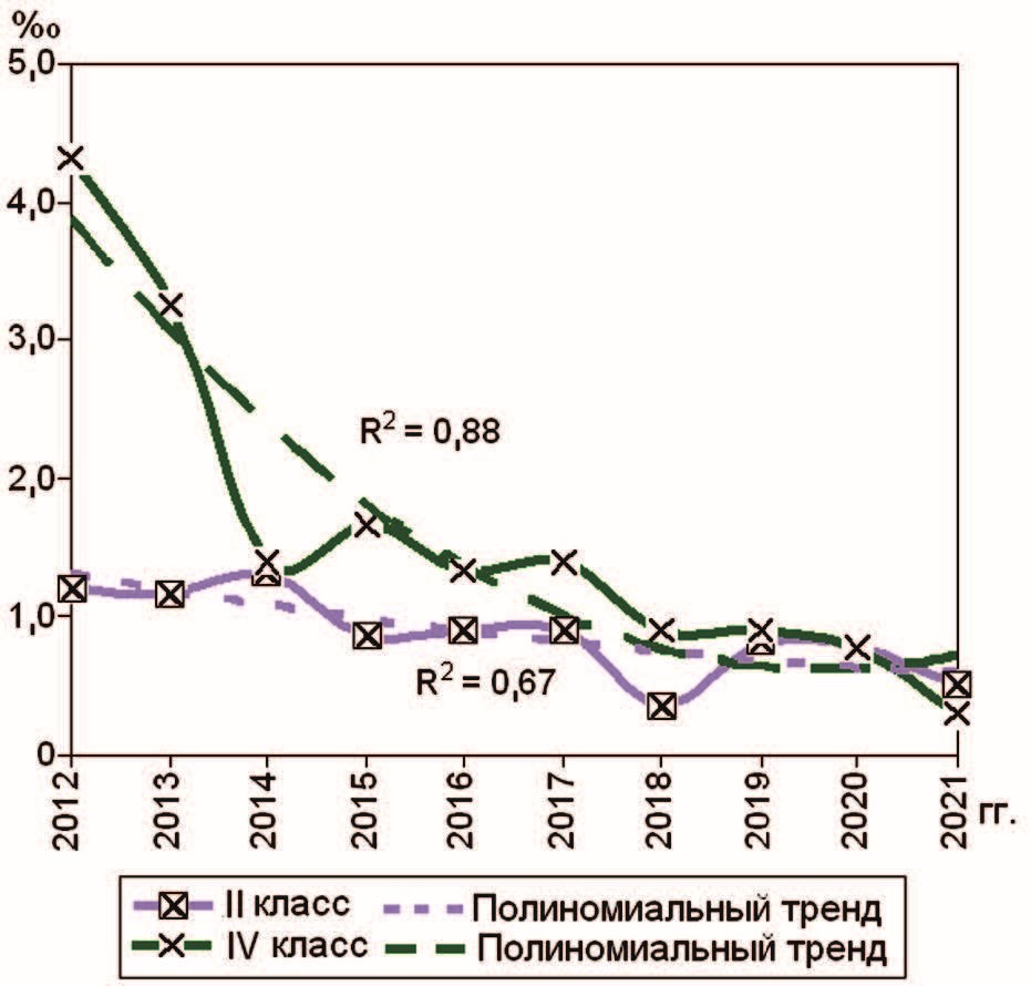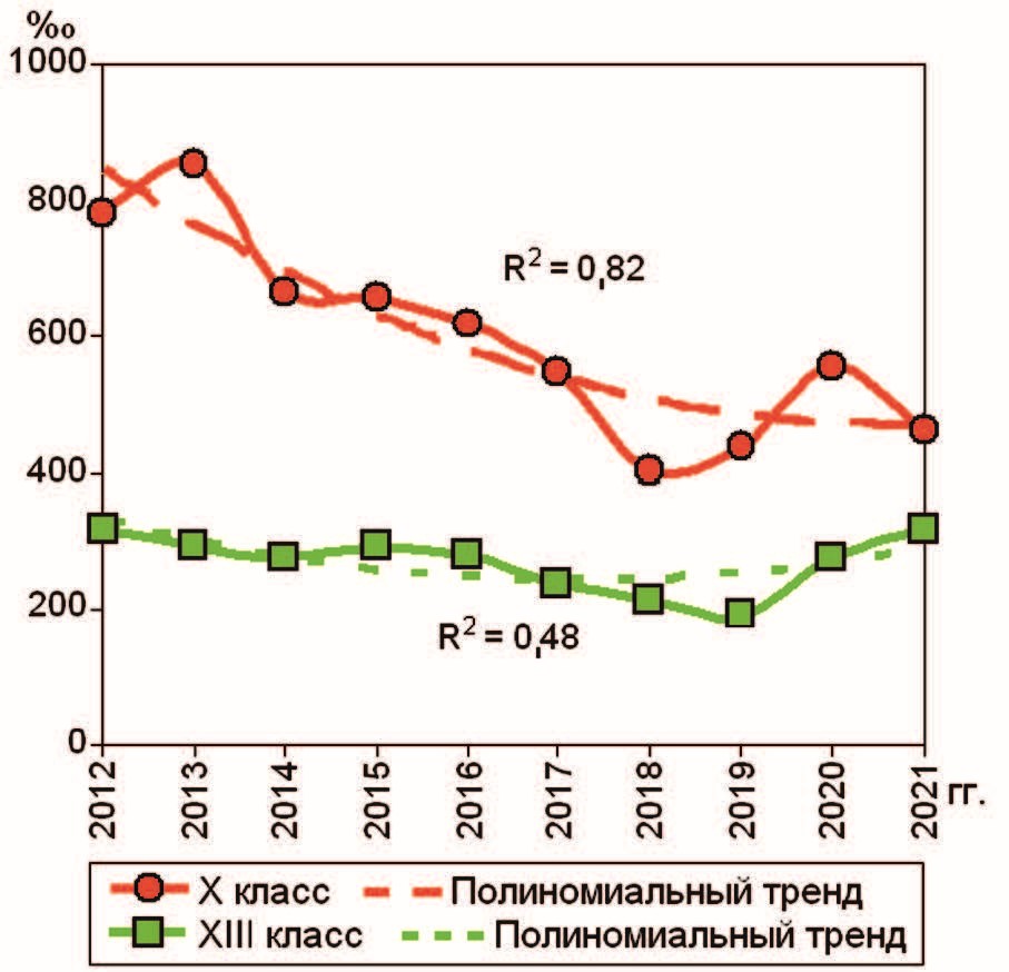 Среднемноголетний уровень общей заболеваемости (первичной и повторной обращаемости) составил 1653,09 ‰, т.е. 2 военнослужащие-женщины в течение 1 года обращались к врачу не менее 3 раз. Динамика уровня общей заболеваемости показана на рис. 1. При значимом коэффициенте детерминации (R2 = 0,82) полиномиальный тренд показывал уменьшение данных. Например, с 2012 по 2021 г. средний уровень общей заболеваемости уменьшился в 1,3 раза.