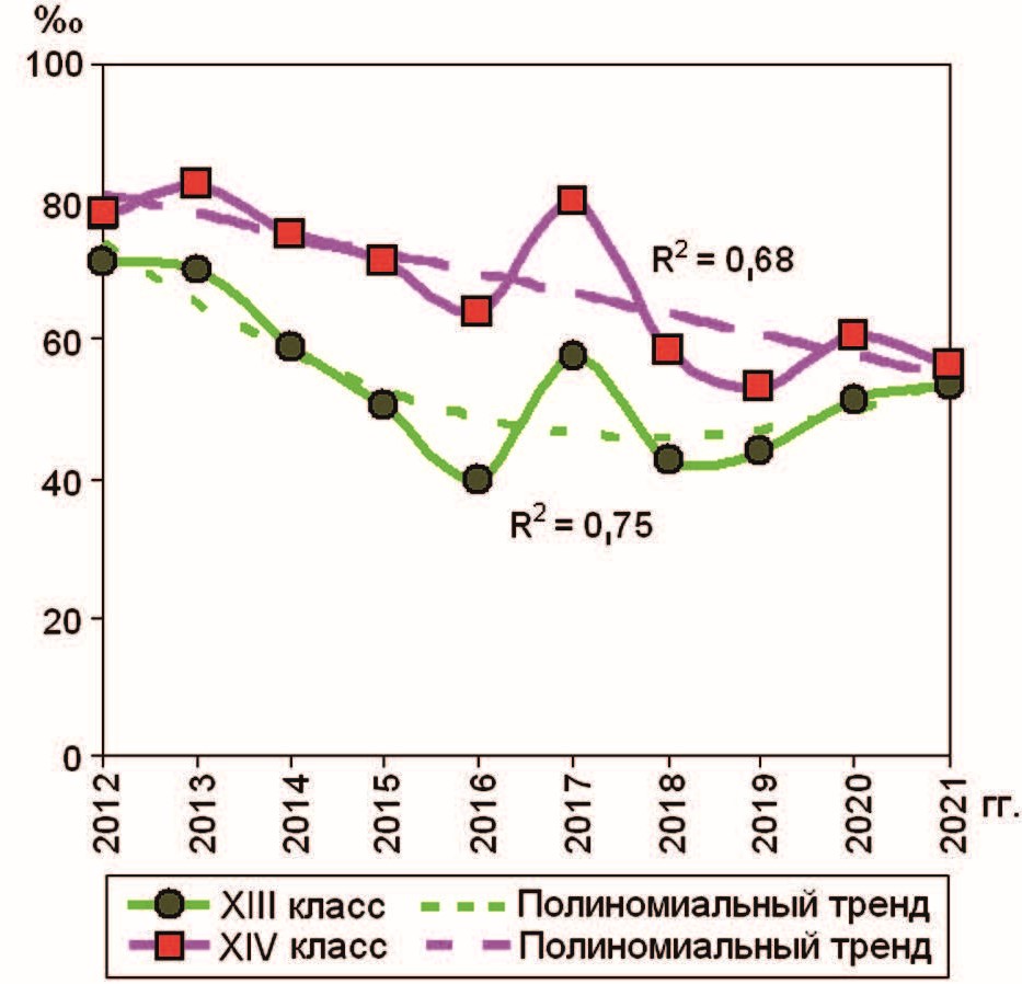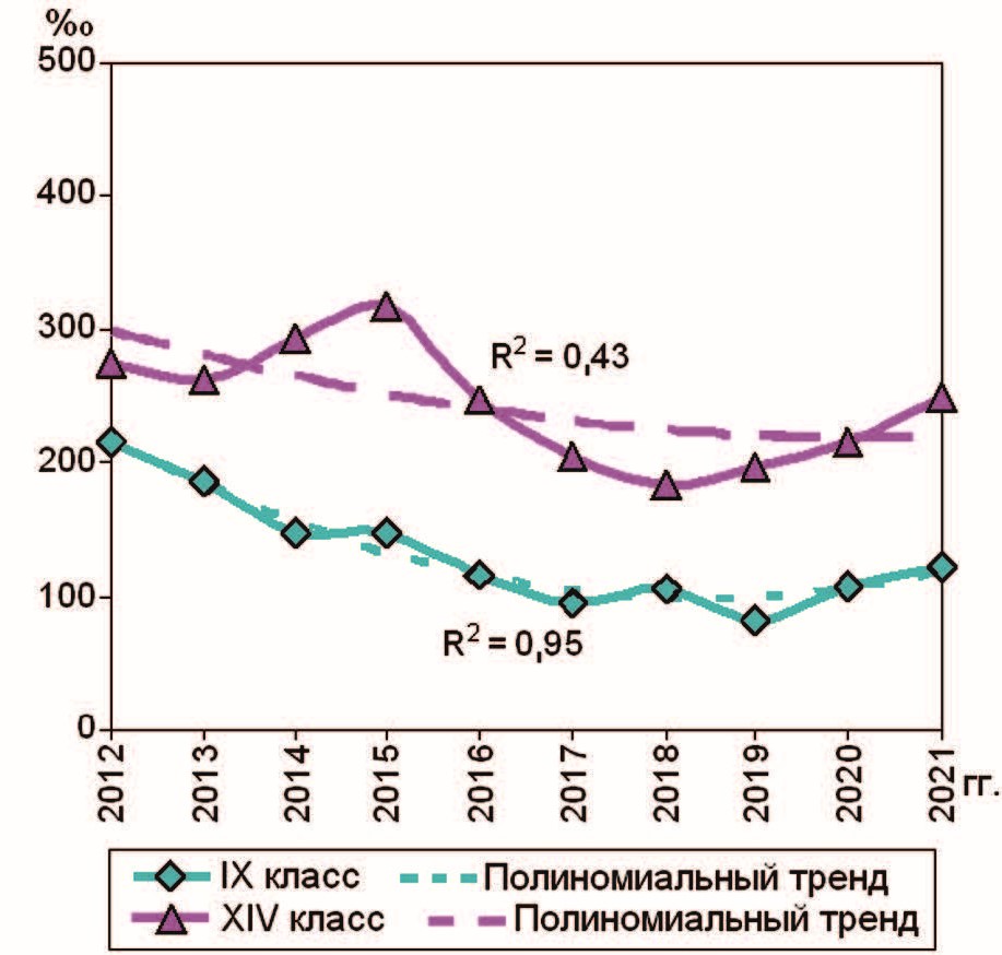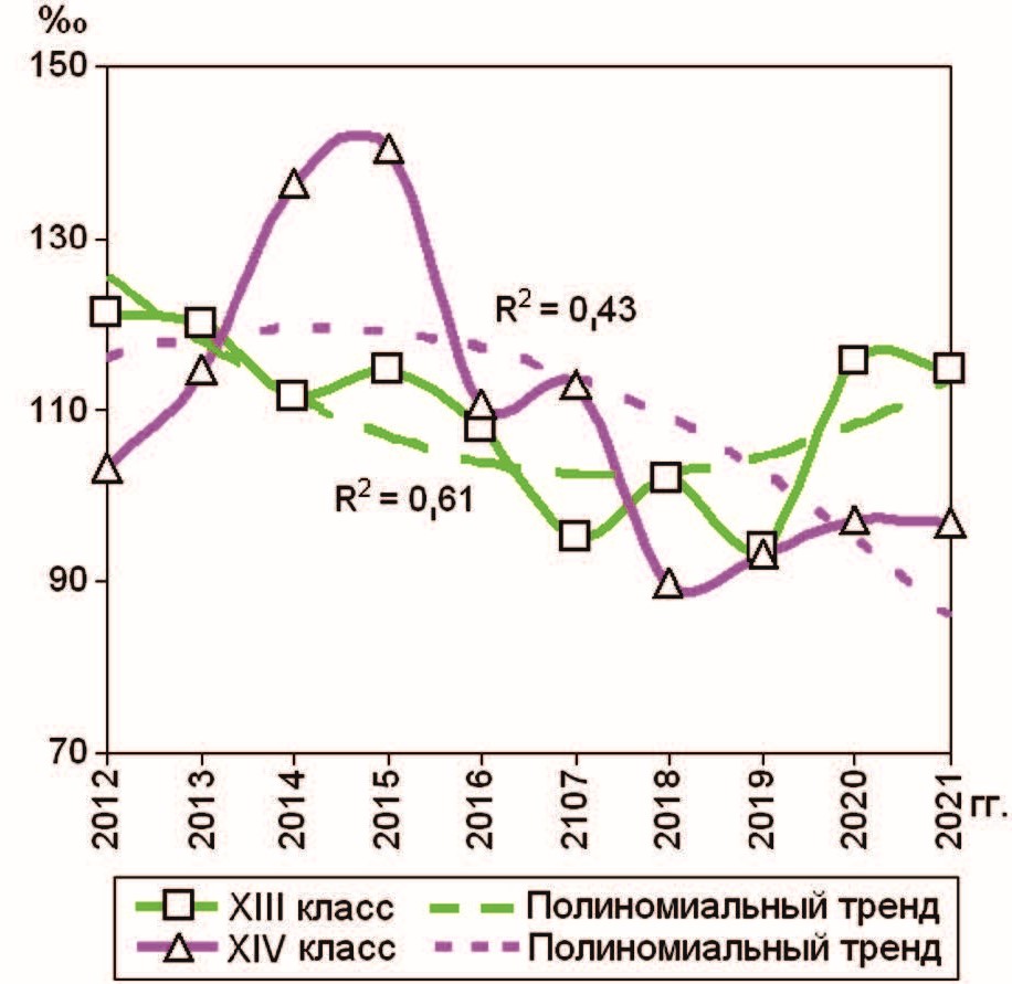 Динамику показателей оценивали с помощью анализа динамических рядов и расчета полиномиального тренда 2-го порядка [9]. Коэффициент детерминации (R2) показывал связь построенного тренда с данными, чем больше был R2 (максимальный 1,0), тем больше приближался он к реально наблюдавшимся данным. Значок ↑ в таблицах показывает тенденцию роста динамики данных, ↓ – уменьшение, → – стабильности, ∪ – U-кривую, ∩ – инвертируемую U-кривую. В ряде случаев правый край тренда был больше (меньше) левого, в этом случае к U-кривой добавляли знаки ↑(↓).