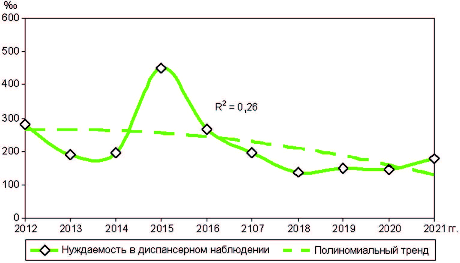Среднемноголетний уровень всей обращаемости (общей заболеваемости), рассчитанный по абсолютным данным у военнослужащих-женщин, с 2012 по 2021 г. составил 1653,1 ‰, первичной заболеваемости – 770,6 ‰, нуждаемости в диспансерном наблюдении – 186,3 ‰, госпитализации – 347,2 ‰, случаев трудопотерь – 898,9 ‰, дней трудопотерь – 6964 ‰, увольняемости – 5,11 ‰, смертности – 59,2 ∙ 10–5. При разных по значимости коэффициентах детерминации полиномиальные тренды видов учета заболеваемости показывали тенденции уменьшения данных.