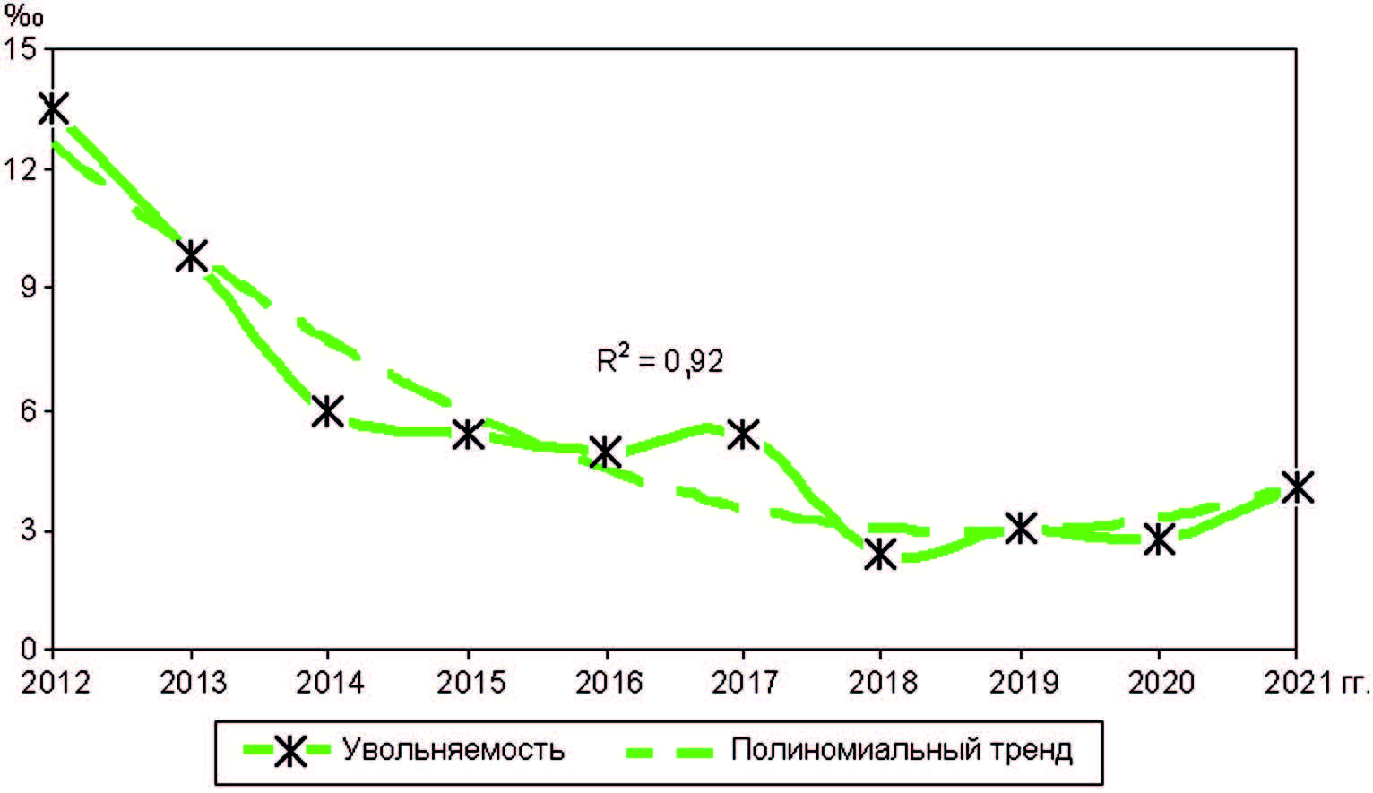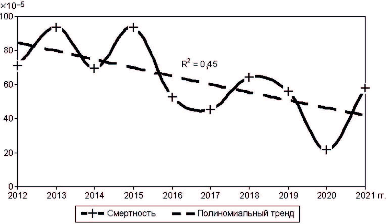 Среднемноголетний уровень смертности составил 59,22 ∙ 10–5. Динамика уровня смертности показана на рис. 23. При низком коэффициенте детерминации (R2 = 0,92) полиномиальный тренд показывал тенденцию уменьшения данных. Например, снижение смертности военнослужащих-женщин за 10 лет с 2012 по 2021 г. было в 1,2 раза.