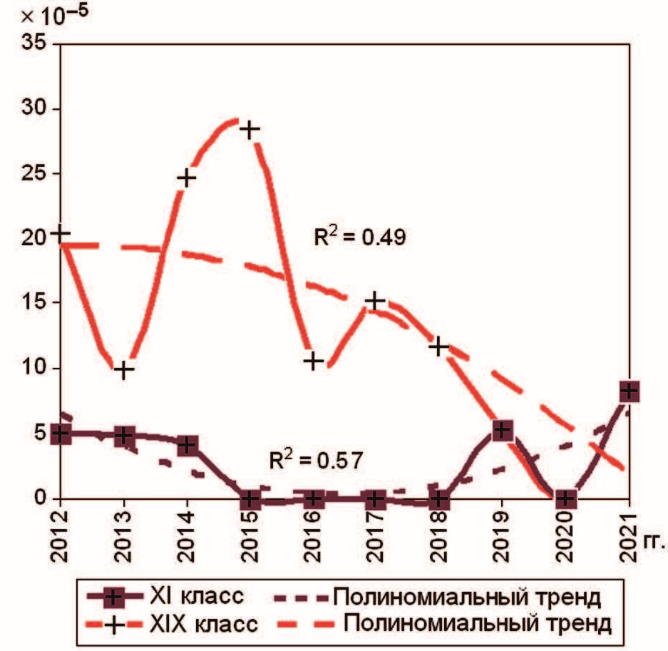 На рис. 25, 26 показана динамика показателей смертности от болезней и травм по классам болезней, составивших наибольшие доли в структуре. При разных по значимости коэффициентах детерминации полиномиальные тренды уровней смертности военнослужащих- женщин от новообразований (II класс) (см. рис. 25) и травм, отравлений и некоторых других последствий воздействий внешних причин (XIX класс) (см. рис. 26) демонстрировали тенденции уменьшения данных, от болезней системы кровообращения (IX класс) (см. рис. 25) и органов пищеварения (XI класс) (см. рис. 26) – тенденции увеличения показателей.
