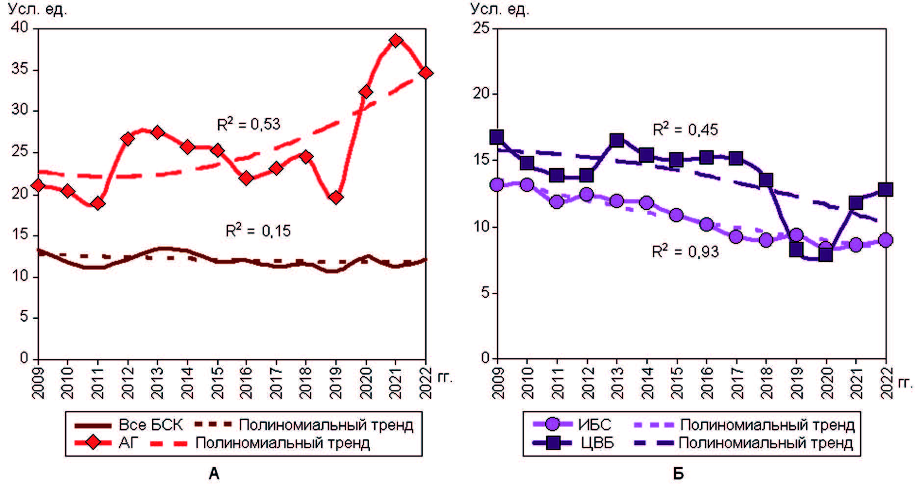 Полиномиальные тренды значений коэффициентов хронизации всех форм БСК, а также при ИБС и ЦВБ являлись нисходящими (см. рис. 3Б), при АГ (см. рис. 3А) – был восходящим. В 2009–2023 гг. темп прироста значения коэффициента для АГ составил 64,5 %, убыли для ИБС – 31,8 %, для ЦВБ – 23,7 %. Поиск причин разнонаправленной динамики уровня хронизации групп состояний не являлся предметом настоящего исследования. Вместе с тем, авторы статьи обращают внимание на актуальность этой задачи. Поступательное изменение значения показателя в долгосрочной перспективе может быть обусловлено сдвигами в состоянии популяционного здоровья (детерминирующими, соответственно, уровень инцидентности заболеваний), положительной или отрицательной динамикой выживаемости пациентов (предопределяющей уровень распространенности заболевания). Таким образом, динамика уровня хронизации комплексно отражает результативность реализуемых в регионе программ медицинской профилактики (в том числе, направленных на формирование установок на ведение гражданами здорового образа жизни), а также работы региональной кардиологической службы. Вместе с тем, его значительные вариации в краткосрочном периоде могут являться косвенным признаком намеренных или непреднамеренных ошибок статистического учета заболеваемости населения.