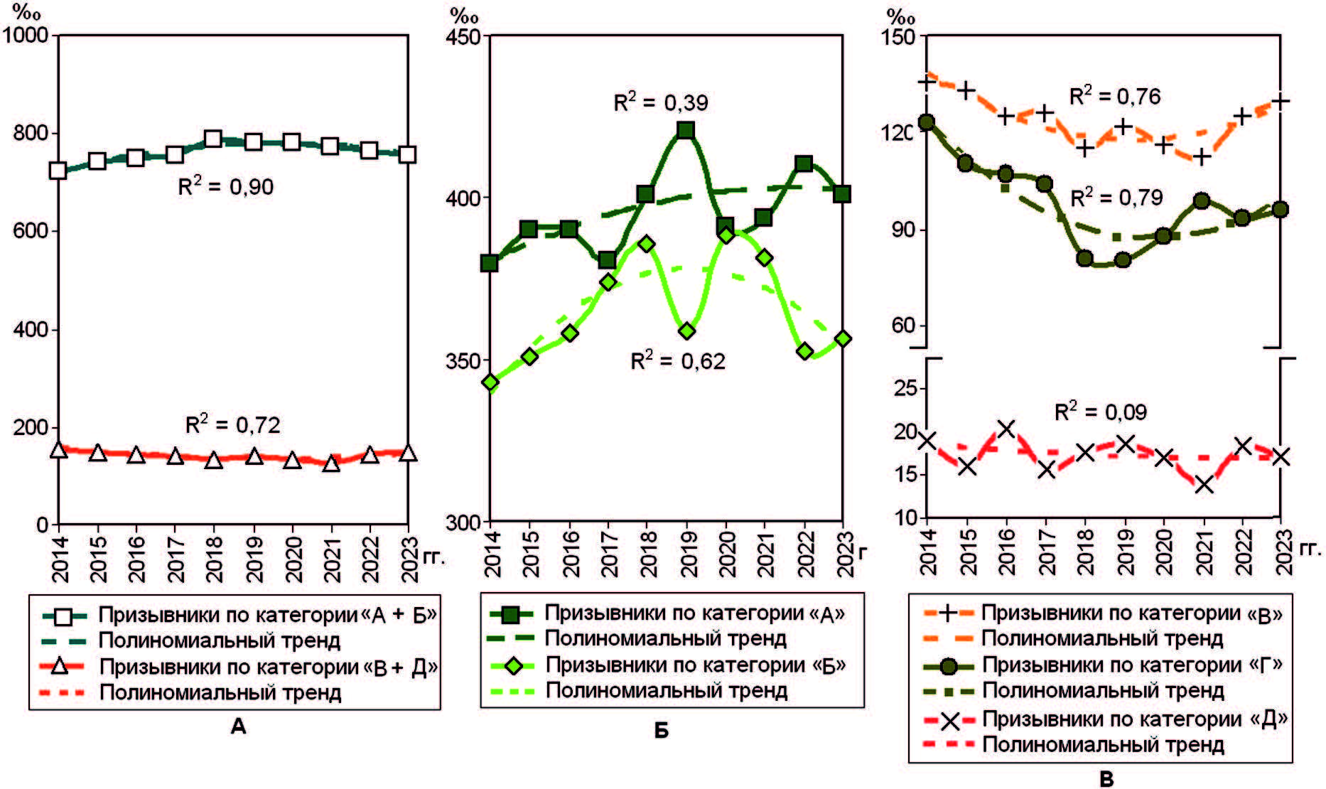 На рис. 2 показана динамика уровня призывников по категориям годности к военной службе. При значимых коэффициентах детерминации полиномиальный тренд уровня призывников, признанных годных к военной службе (обобщенная категория «А + Б»), напоминает инвертированную U-кривую с уменьшением в последний период, негодных или ограниченно годных к военной службе в мирное время (обобщенная категория «В + Д») – уменьшение (см. рис. 2А).