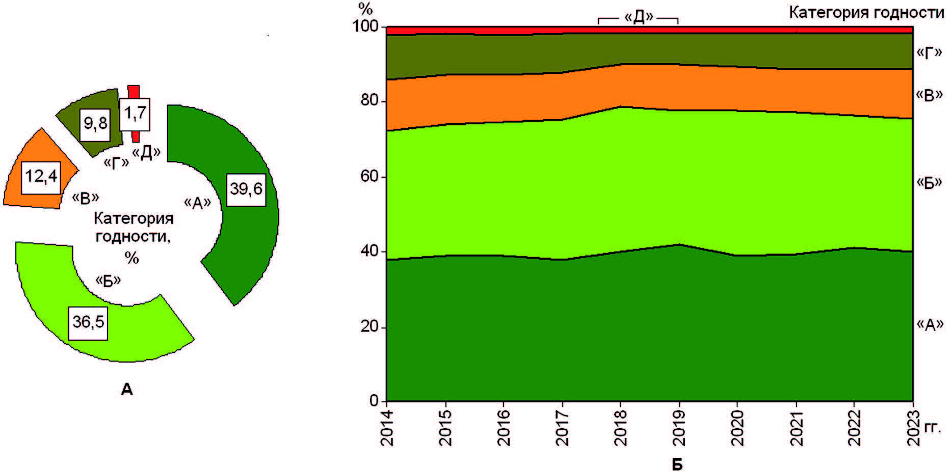 Рис. 3. Структура (А) и динамика структуры (Б) распределения призывников по категориям годности к военной службе.
