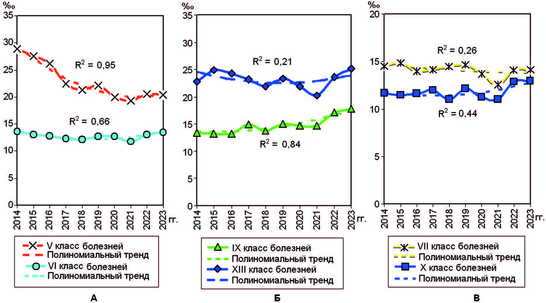 На рис. 4 показана динамика уровня заболеваемости призывников по некоторым ведущим классам болезней. При разных по значимости коэффициентах детерминации полиномиальные тренды показателей психических расстройств и расстройств поведения (V класс) и болезней глаз и его придаточного аппарата (VII класс) показывали уменьшение данных (см. рис. 4А, В), болезней нервной системы (VI класс) и костно-мышечной системы и соединительной ткани (XIII класс) – напоминали U-кривую с тенденцией увеличения данных в последний период наблюдения (см. рис. 4А, Б), болезней системы кровообращения (IX класс) и органов дыхания (X класс) – увеличение (см. рис. 4Б, В).