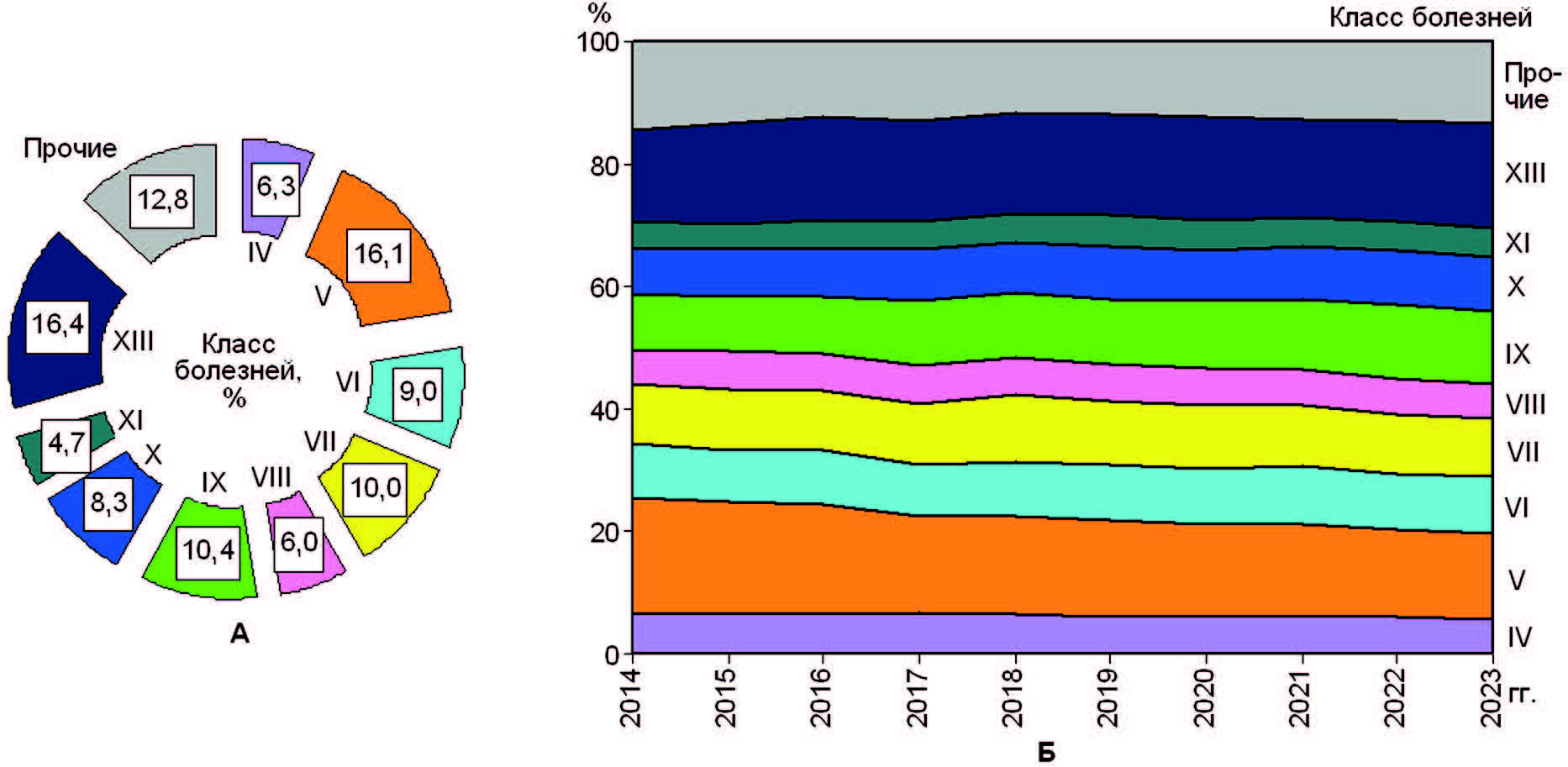 Рис. 5. Структура (А) и динамика структуры (Б) призывников, поставленных на воинский учет (категория годности «В + Д») по причине заболеваний по классам болезней по МКБ-10.