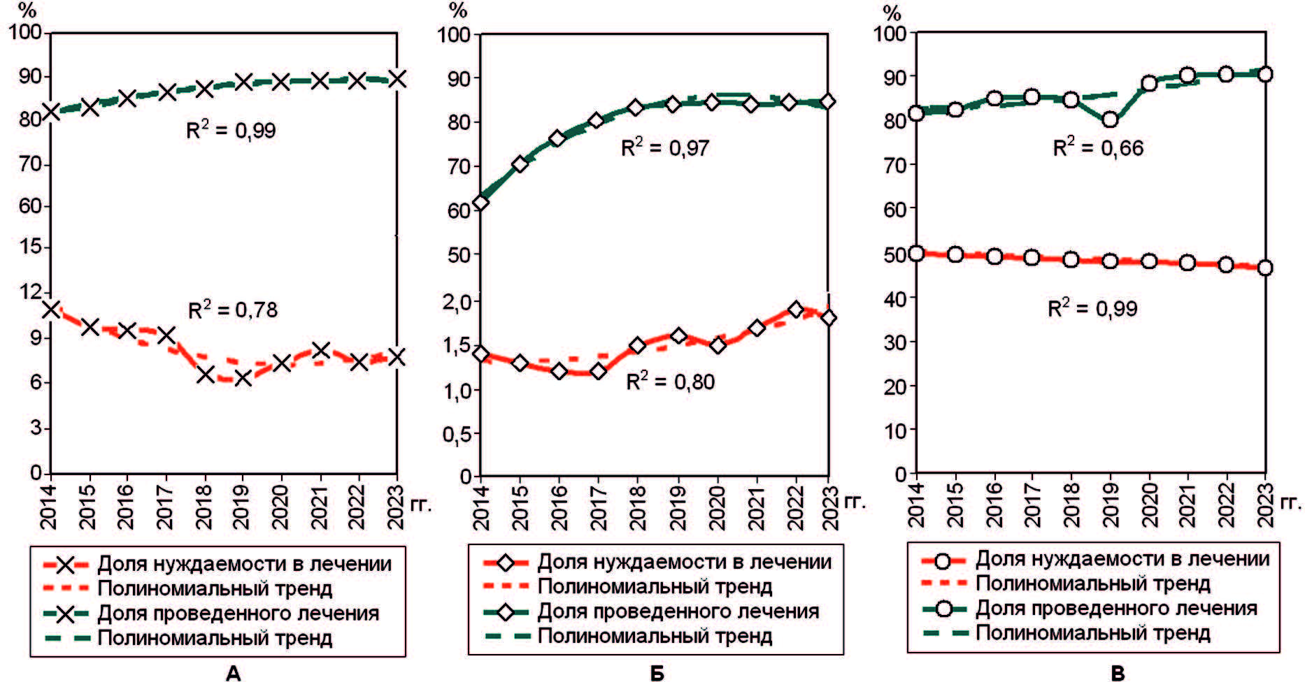 На рис. 6 показана динамика уровней нуждающихся и пролеченных призывников. При высоких коэффициентах детерминации полиномиальный тренд процента призывников, нуждающихся в консервативном лечении, показывает уменьшение, пролеченных – увеличение (см. рис. 6А), нуждающихся в оперативном лечении и пролеченных – рост данных (см. рис. 6Б), нуждающихся в санации полости рта – уменьшение, просанированных призывников – увеличение (см. рис. 6В).