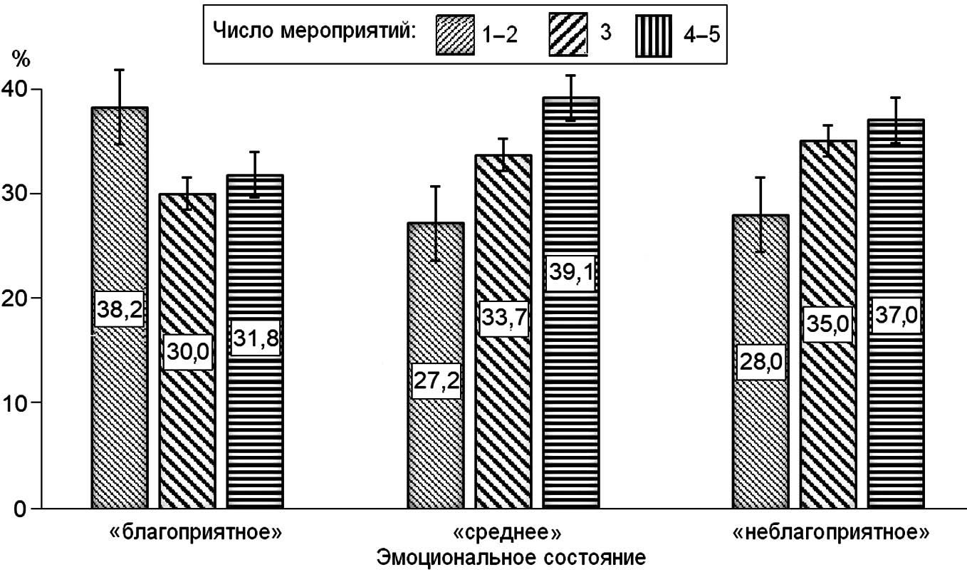 В группах молодых медицинских работников с «благоприятным», «неблагоприятным» и «средним» эмоциональным состоянием присутствовали лица, использующие 2–4 стратегии и более профилактики и коррекции (рисунок).