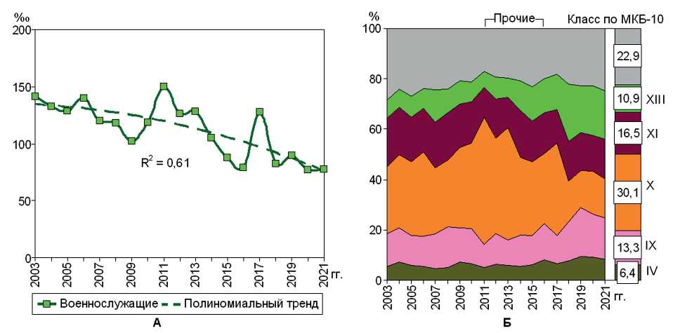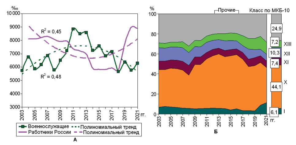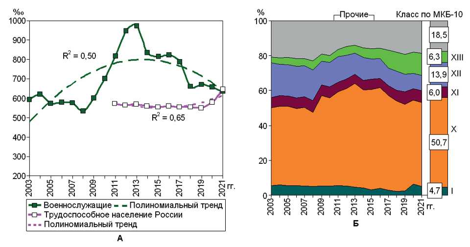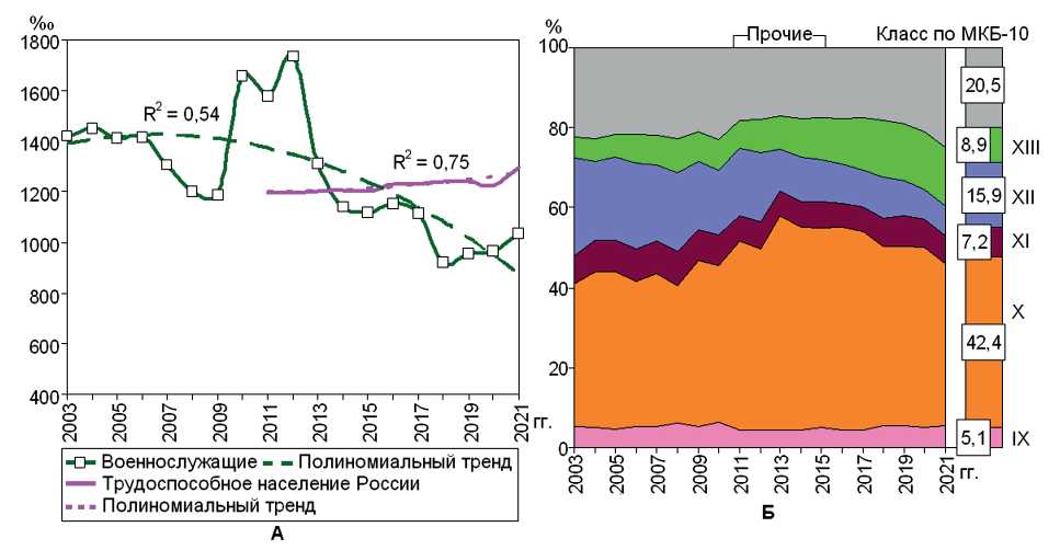 Рис. 1. Динамика уровня общей заболеваемости военнослужащих ВС России и населения трудоспособного возраста России (А), долей в структуре ведущих классов болезней у военнослужащих (Б)