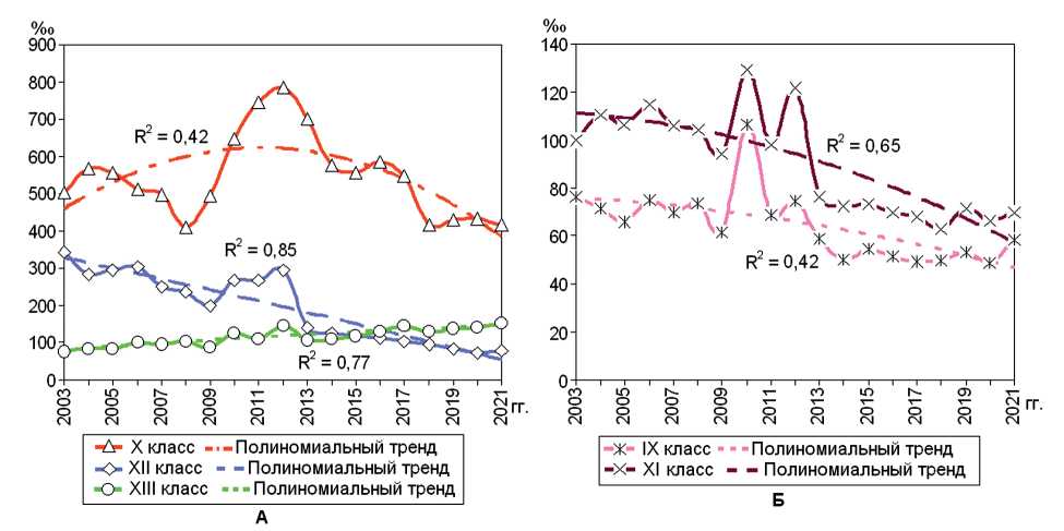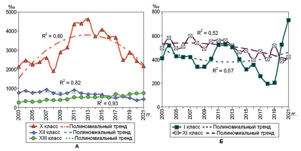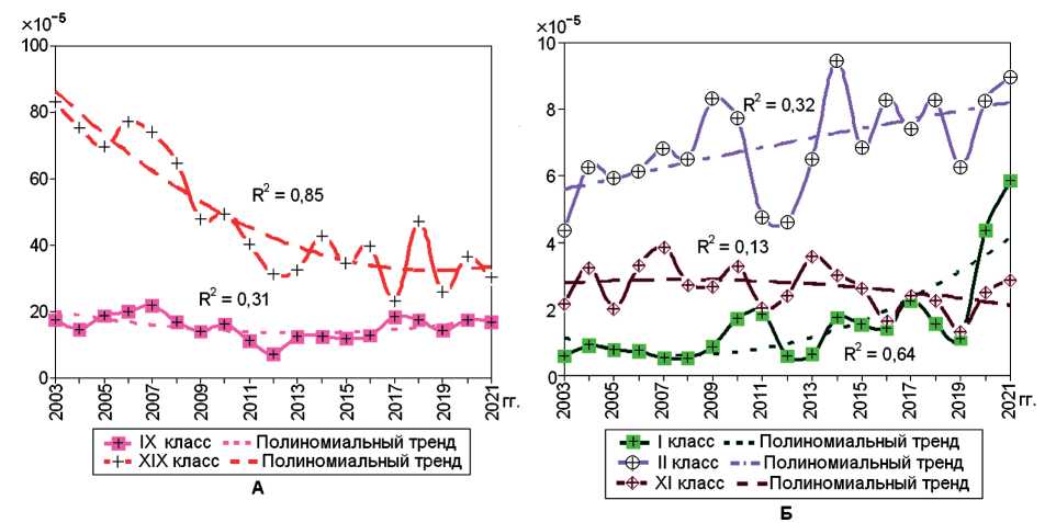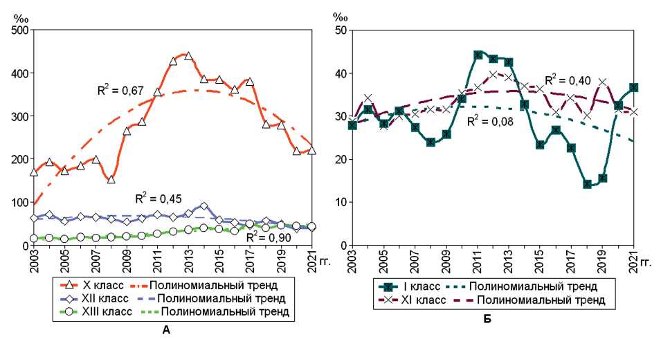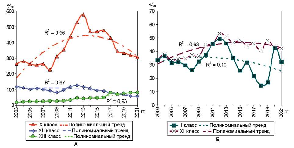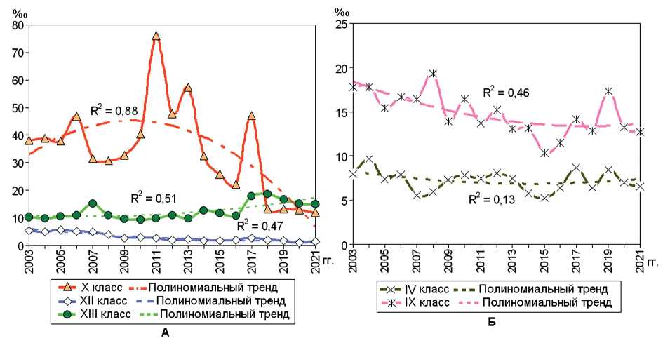 При разных по значимости коэффициентах детерминации полиномиальные тренды демонстрируют уменьшение уровней общей заболеваемости с IX, XI и XII классом (рис. 2А, Б), увеличение уровня XIII класса, инвертированную U-кривую со снижением показателей в последний период наблюдения – X класса по МКБ-10 (см. рис. 2А). В динамике структуры общей заболеваемости выявлены тенденции увеличения долей X и XIII класса, уменьшение долей – XI и XII класса, малоизменяемой доли – IX класса болезней по МКБ-10 (см. рис. 1Б).