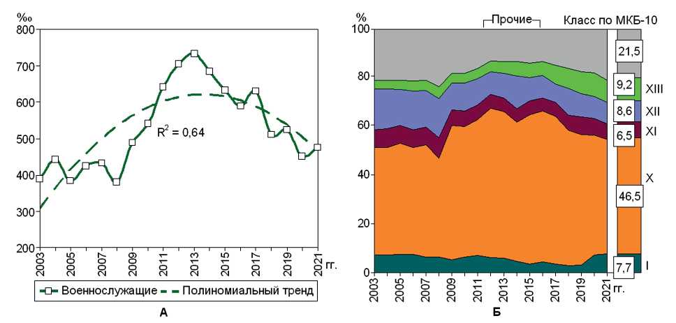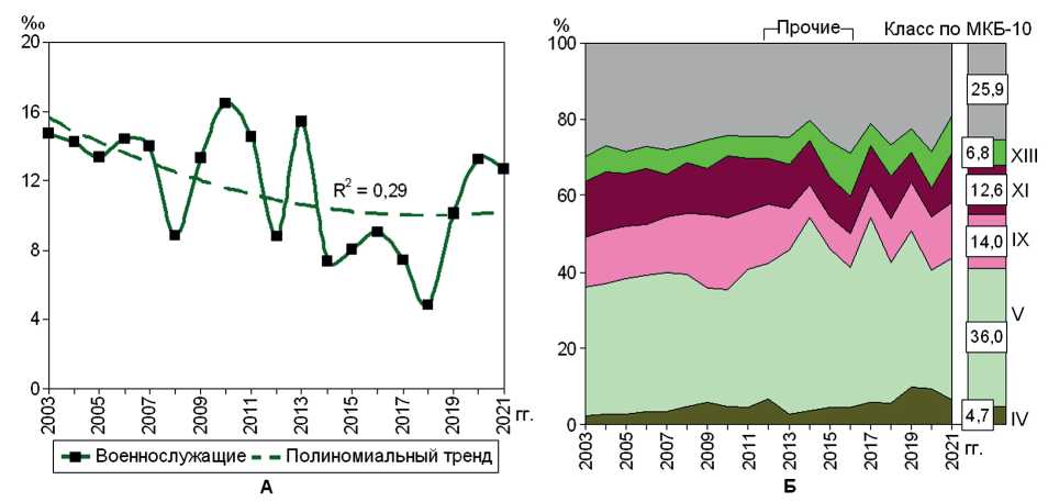 Methods. We studied the morbidity rates of among the military based on the database of medical reports (3/MED form) and open-access publications. Medical and statistical indicators for the main chapters of diseases were correlated with the International Statistical Classification of Diseases and Related Health Problems, 10th revision (ICD-10). Morbidity was calculated in ppm (%) and mortality – per 100,000 people (10–5). The paper reports long-term averages calculated based on absolute data, arithmetic mean values and standard errors (M ± m). The dynamics was assessed by analyzing the dynamic time series and the 2nd order polynomial trend Pearson’s correlation coefficient was used to calculate the congruence between trends.