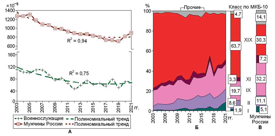 Рис. 13. Динамика уровня смертности военнослужащих ВС России и мужчин в трудоспособном возрасте в России (А), долей в структуре ведущих классов причин смерти военнослужащих (Б) и мужчин в России (В)