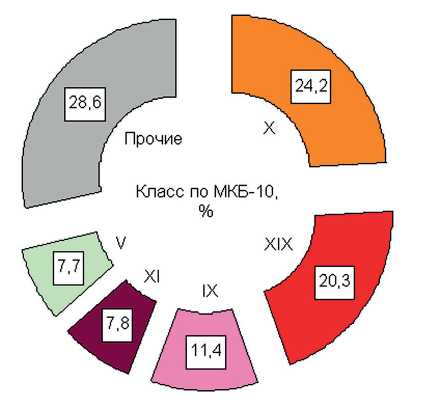 В 71,4 % структуру военно-эпидемиологической оценки заболеваемости военнослужащих ВС России составили показатели болезней органов дыхания (X класс) с долей 24,2 %, травм, отравлений и некоторых других последствий воздействия внешних причин (XIX класс) – 20,3 %, болезней системы кровообращения (IX класс) – 11,4 %, органов пищеварения (XI класс) – 7,8 %, психических расстройств и расстройств поведения (V класс) – 7,7 % соответственно.