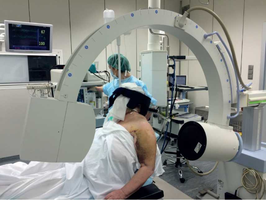 Рис. 1. Укладка пациента на ортопедическом столе в положении «пляжное кресло». Рентгенологический контроль с помощью С-дуги