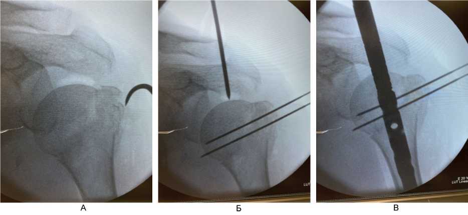 Рис. 5. Этапы репозиции отломков и установки интрамедуллярного штифта при переломах типа Б по АО. А – прошивание сухожилий манжеты ротаторов с костными отломками; Б – репозиция и временная фиксация отломков тонкими спицами Киршнера, установка направляющего устройства для вскрытия интрамедуллярного канала плечевой кости; В – установка интрамедуллярного штифта в плечевую кость