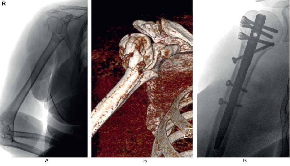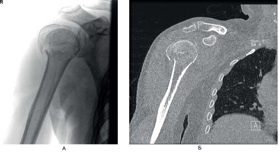 Рис. 8. Больной А., 50 лет. А – рентгенография плечевого сустава в стандартных проекциях; Б – компьютерная томография до операции