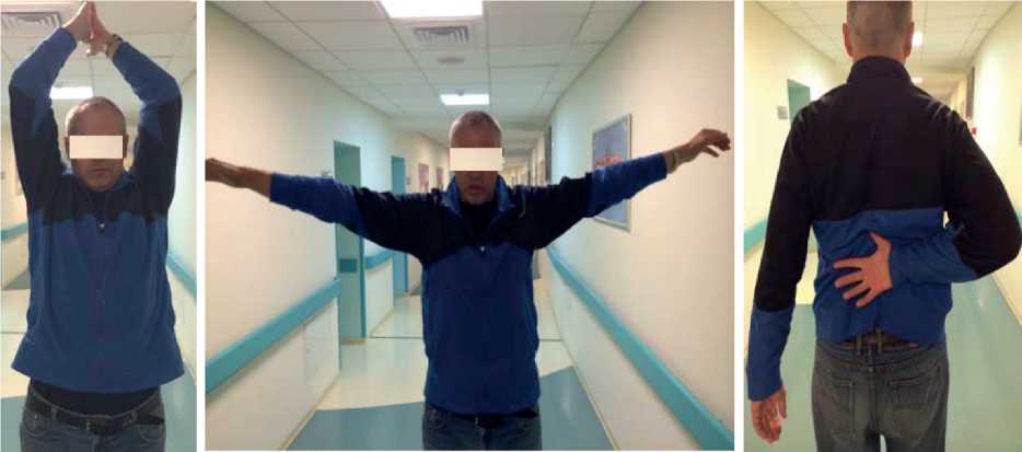 Перелом по классификации АО – С3.1. На 2-е сутки после поступления выполнено оперативное вмешательство – БИОС хирургической шейки правой плечевой кости. Рентгенография на 1-е сутки после операции представлена на рис. 9А, Б, контрольная рентгенография плечевого сустава через 6 мес после операции – на рис. 9В. Функциональный результат после операции – на рис. 10.